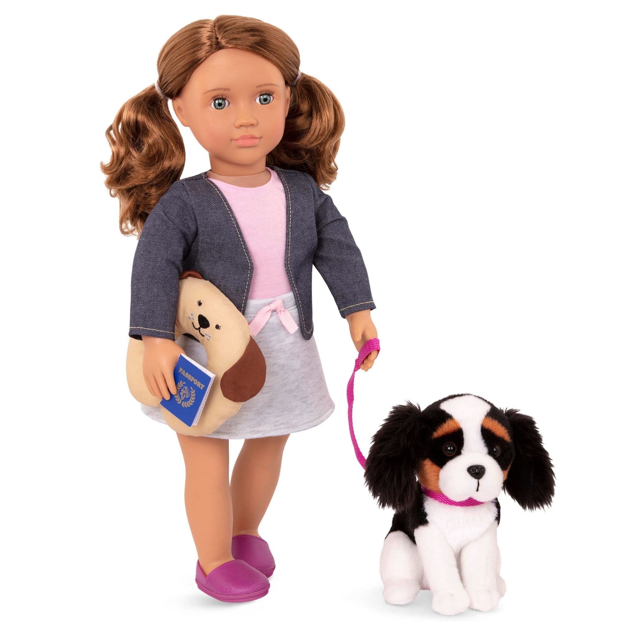• Sættet indeholder: babydukke, bluse, nederdel, undertøj, sko, King Charles Spaniel-hvalp, snor, halsbånd, rejsepude, pas