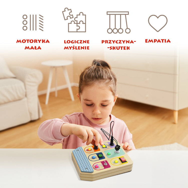 Manipulationsbrættet fra Topbright er et fantastisk pædagogisk legetøj, der giver dit barn mulighed for at eksperimentere med forskellige kontakter og knapper.