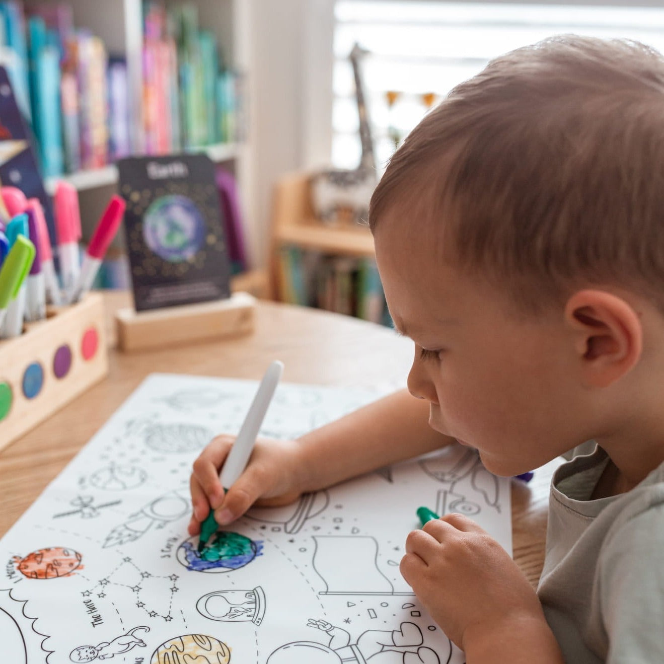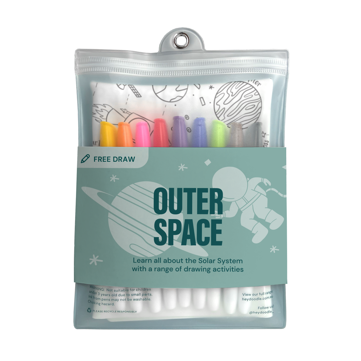 Opdag kosmiske mysterier ved at farvelægge planeter, raketter, stjerner og andre galaktiske objekter på den A3-størrelse silikonemåtte.