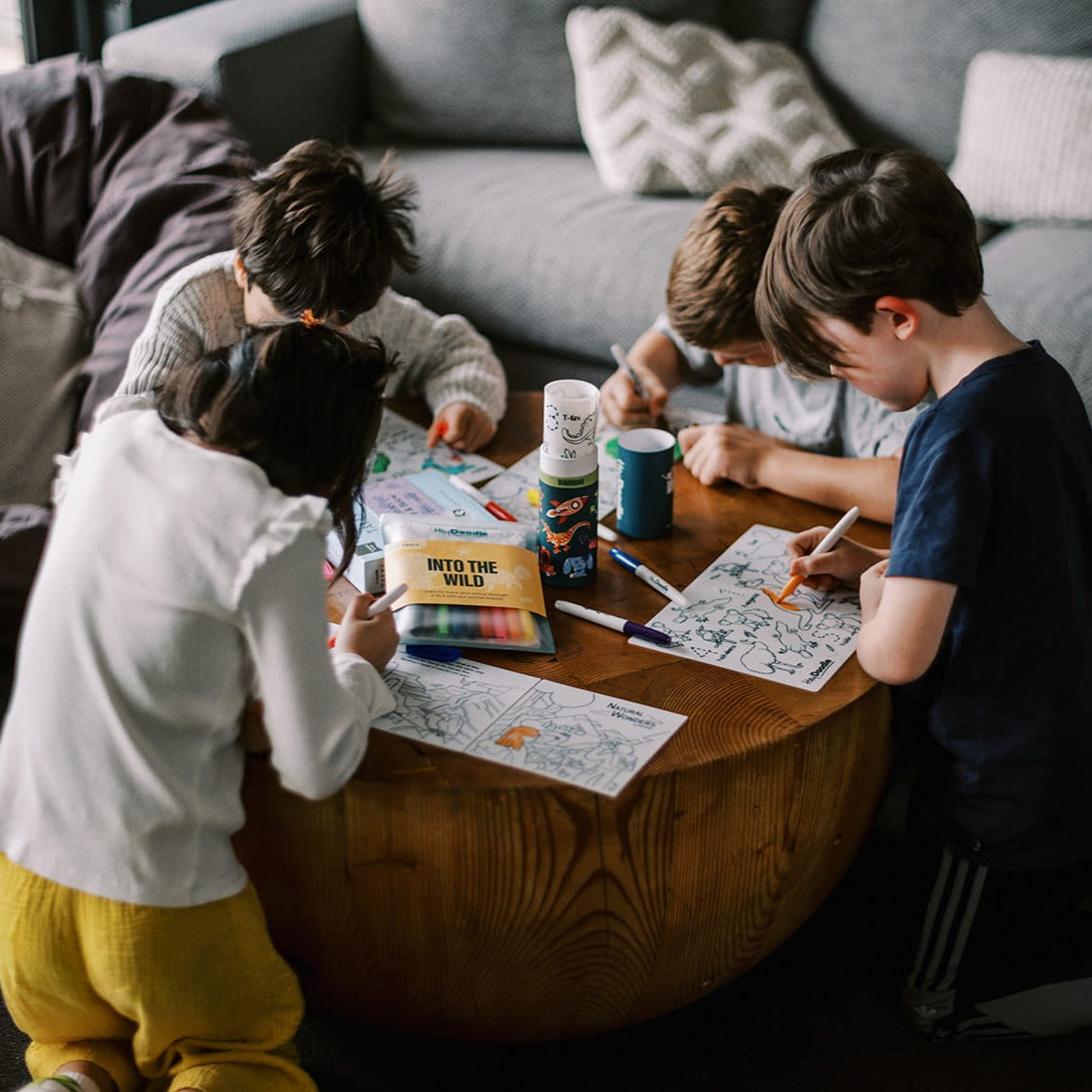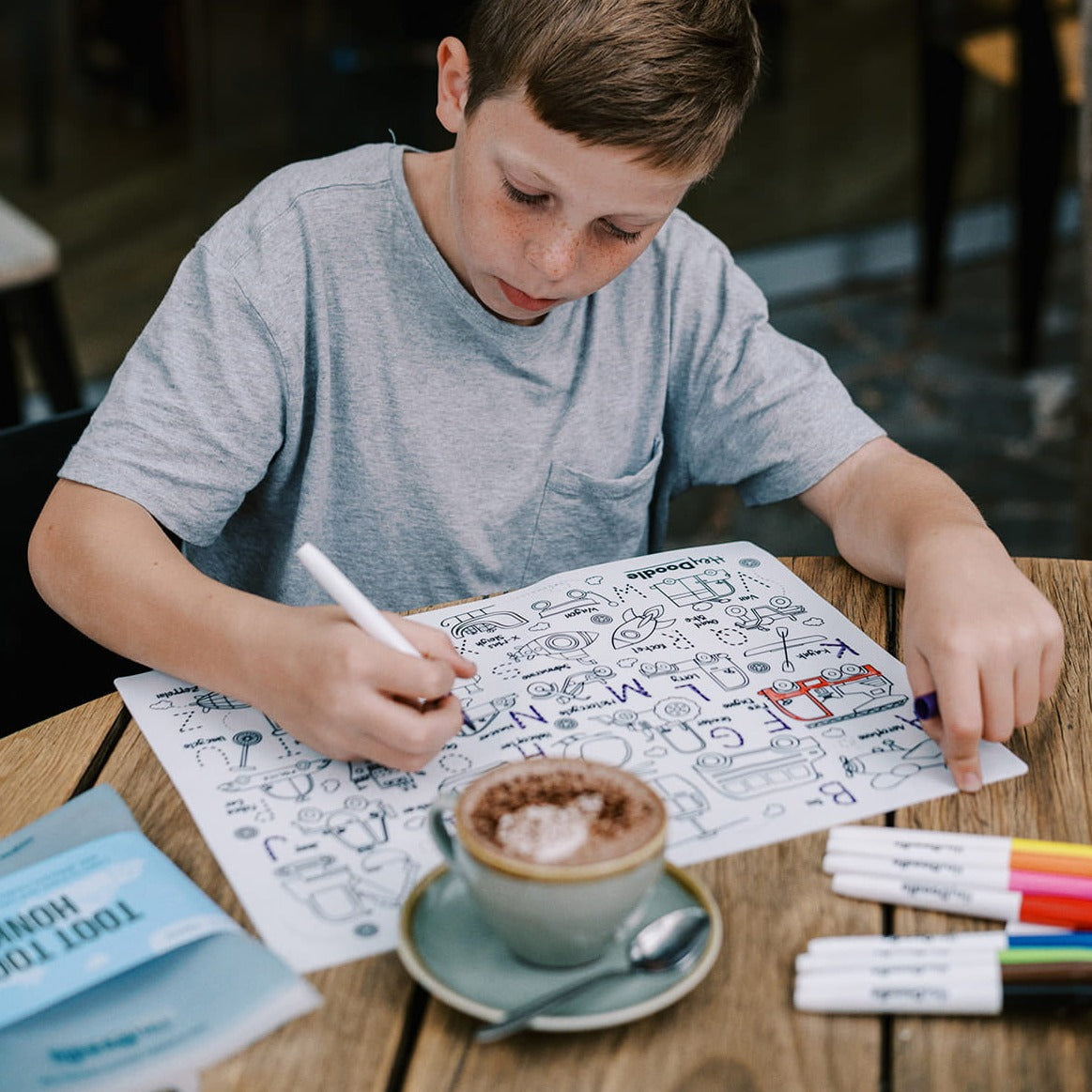 Der medfølger ni giftfri tuschpenne, der er specielt designet til små hænder og tørrer hurtigt for at forhindre, at farverne smitter af på måtten.