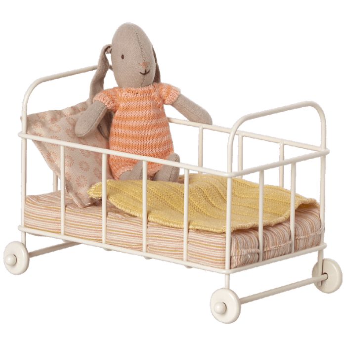 En hyggelig barneseng lavet af metal og udstyret med madras, tæppe og pude.