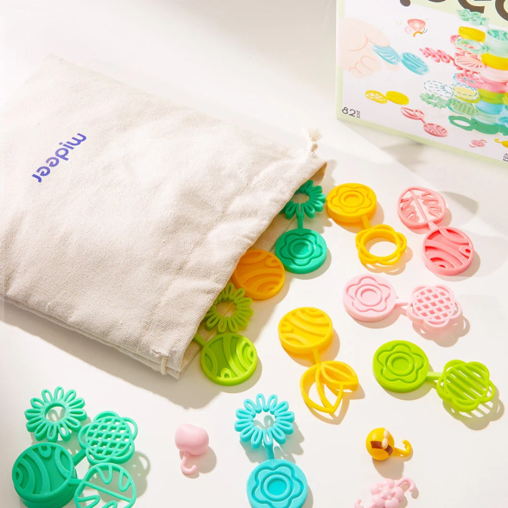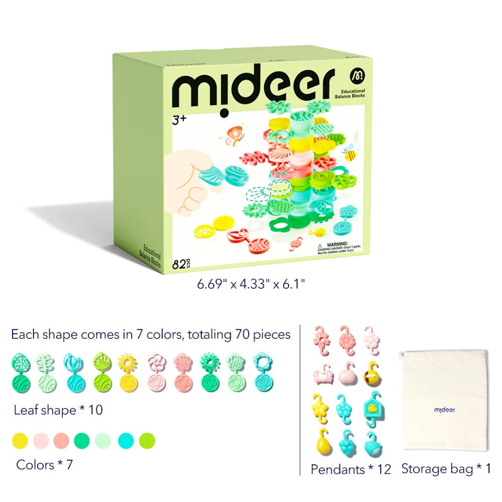 Legetøjet indeholder hele 70 brikker og 12 vedhæng, som kan arrangeres på mange måder – man kan bygge et farverigt træ, sortere efter farve eller konstruere helt nye strukturer. Mideers børnepuslespil inspirerer til eksperimentering ved at hjælpe med at forstå forholdet mellem vægt og balance.
