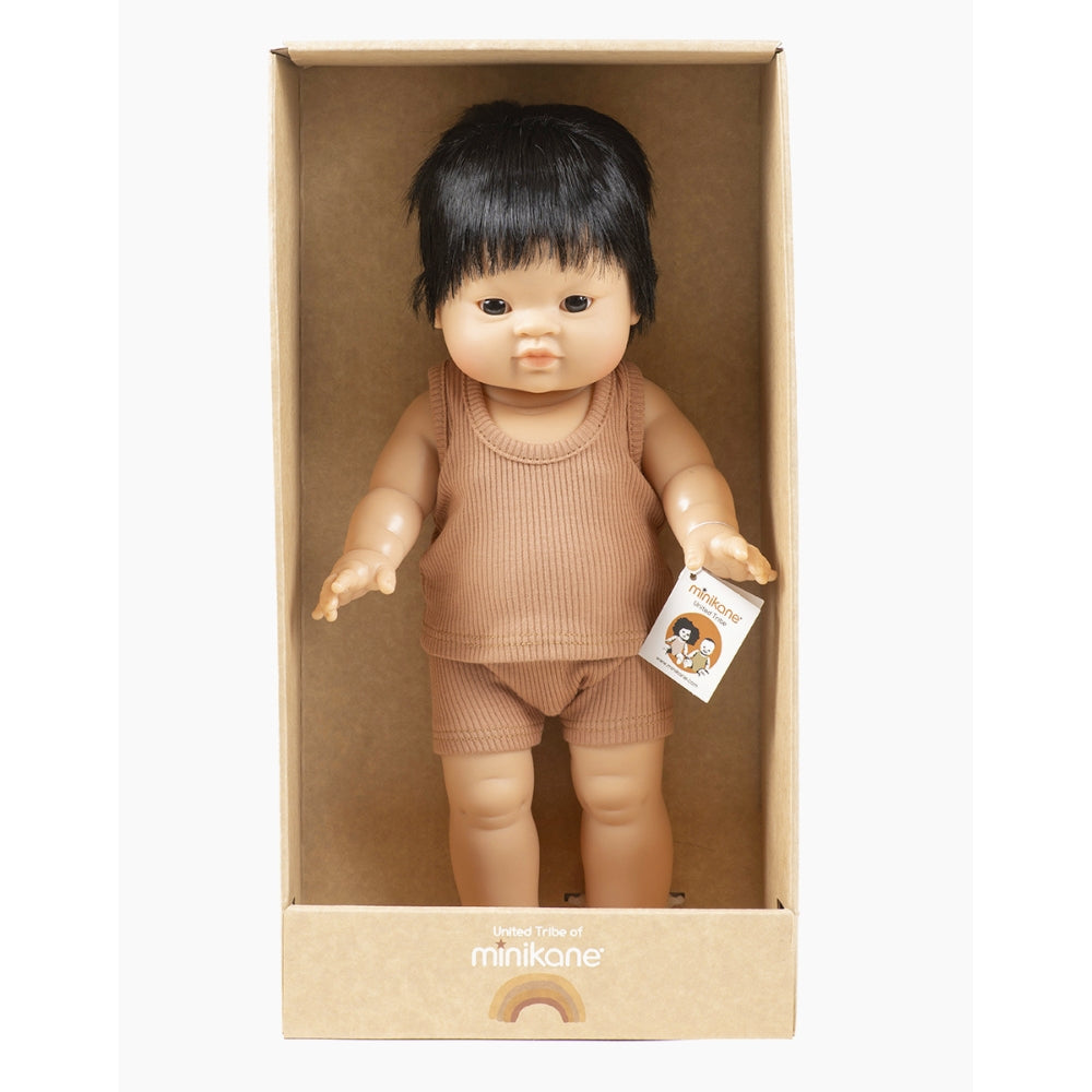 Dukken er 37 cm høj og leveres med ribbet undertøj (Marcel-top) i en brun sukkerfarve.