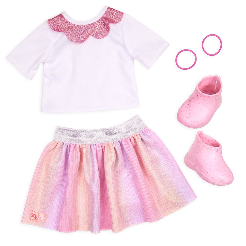 - Sættet indeholder: en 46 cm dukke, en bluse med en glitrende dekorativ kant omkring halsen foran, en glitrende nederdel med farver, der går over i hinanden, og glitrende syninger i taljen, to hårelastikker, undertøj og sko.