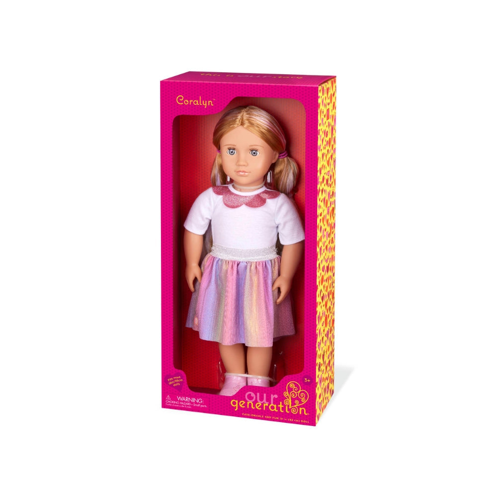En dejlig Coralyn blond babydukke med subtile lysende flerfarvede højdepunkter, iført en skinnende farverig nederdel fra Our Generation.