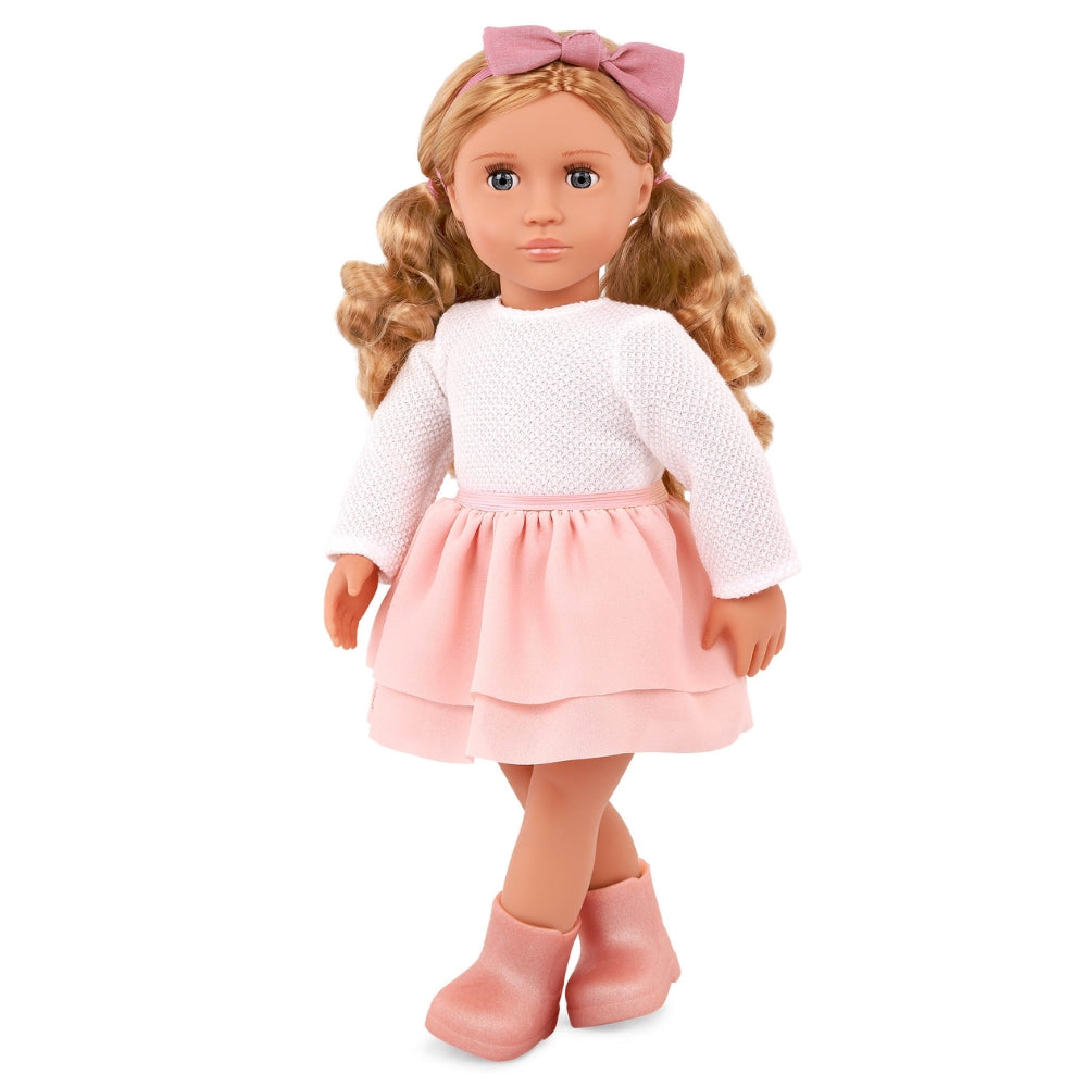 En dejlig blond Effie-babydukke i en lys stil sammensat af hvid og subtile nuancer af lyserødt fra Our Generation.