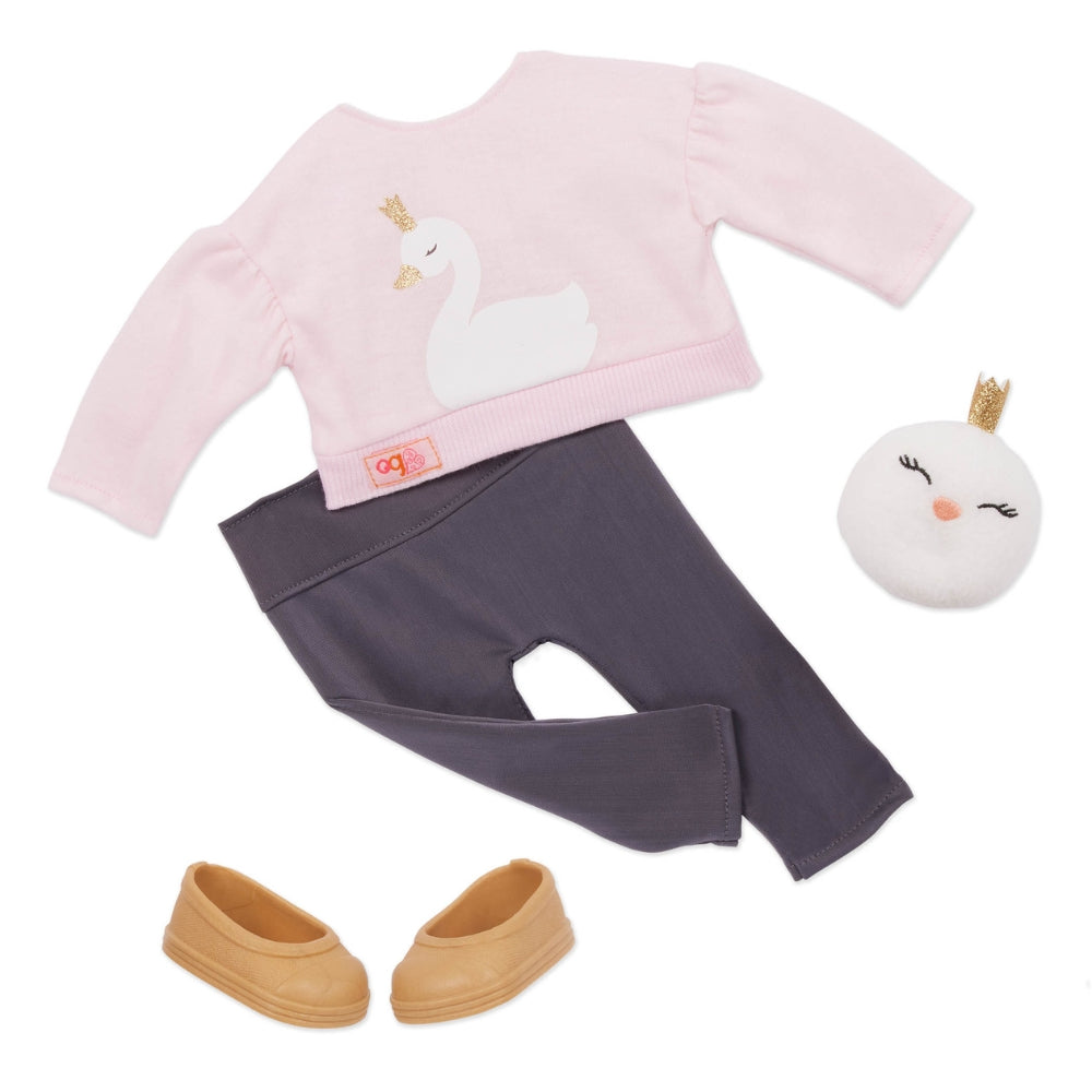 - Sættet indeholder: 46 cm dukke, bluse med svanemotiv, leggings med høj talje, blødt "svane"-pude, undertøj og sko