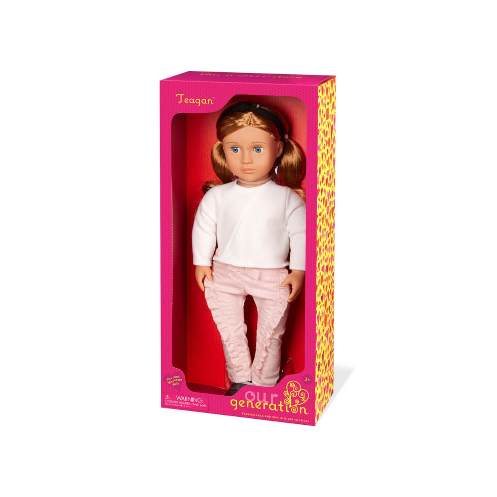Dejlig Teagan rødhåret babydukke med fregner og bukser med flæser fra Our Generation.