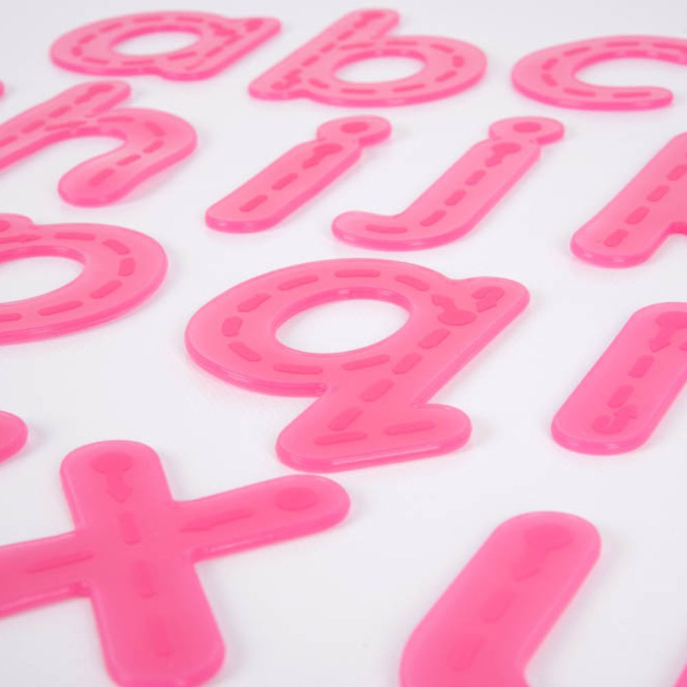 De gennemskinnelige lyserøde børnebogstaver i blødt og smidigt silikone er det perfekte supplement til hverdagens leg.