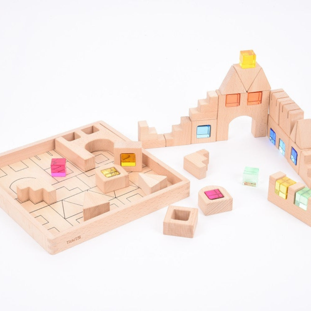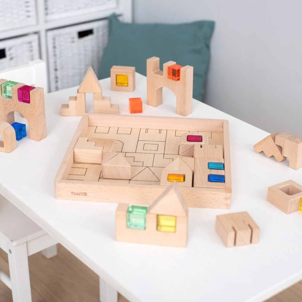 Dette sæt består af en række glatte træklodser og farverige juvelterninger, pakket i en robust træbakke med faner, der gør det nemt at holde orden.