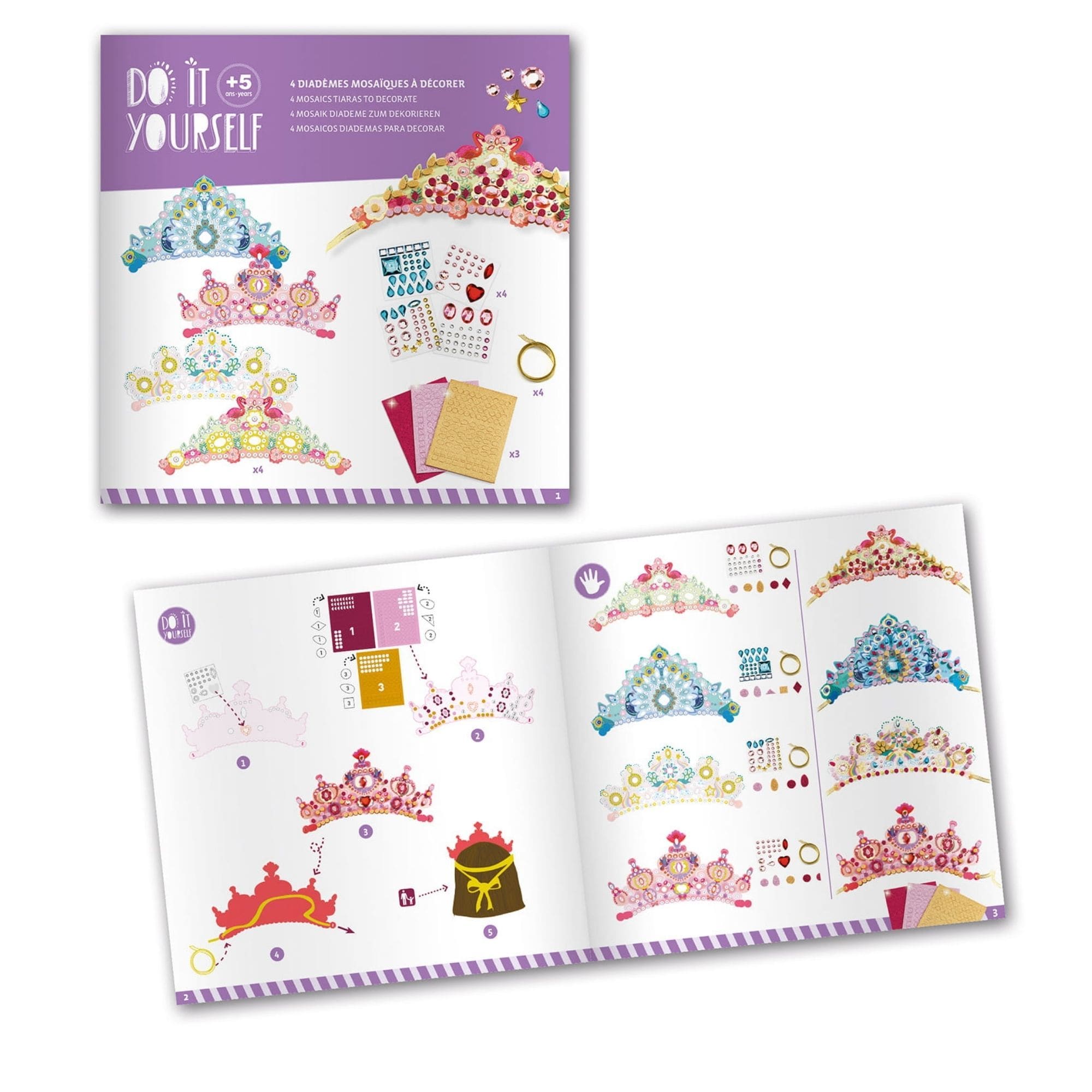 Sættet indeholder: 4 trykte prinsessekroner lavet af tykt karton, 4 bånd, 3 ark selvklæbende metallisk glittermosaik, 4 ark selvklæbende diamanter og trin-for-trin billedvejledning