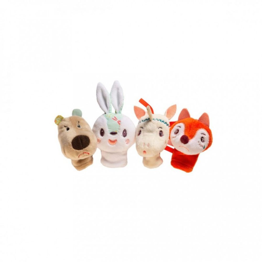 Sættet med fingerdukker indeholder 4 farverige skovdyr.