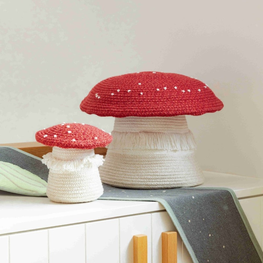 Denne legetøjskurv i form af en paddehat er ikke kun et sted til små skatte, men også et dekorativt element, der sætter gang i børns fantasi.