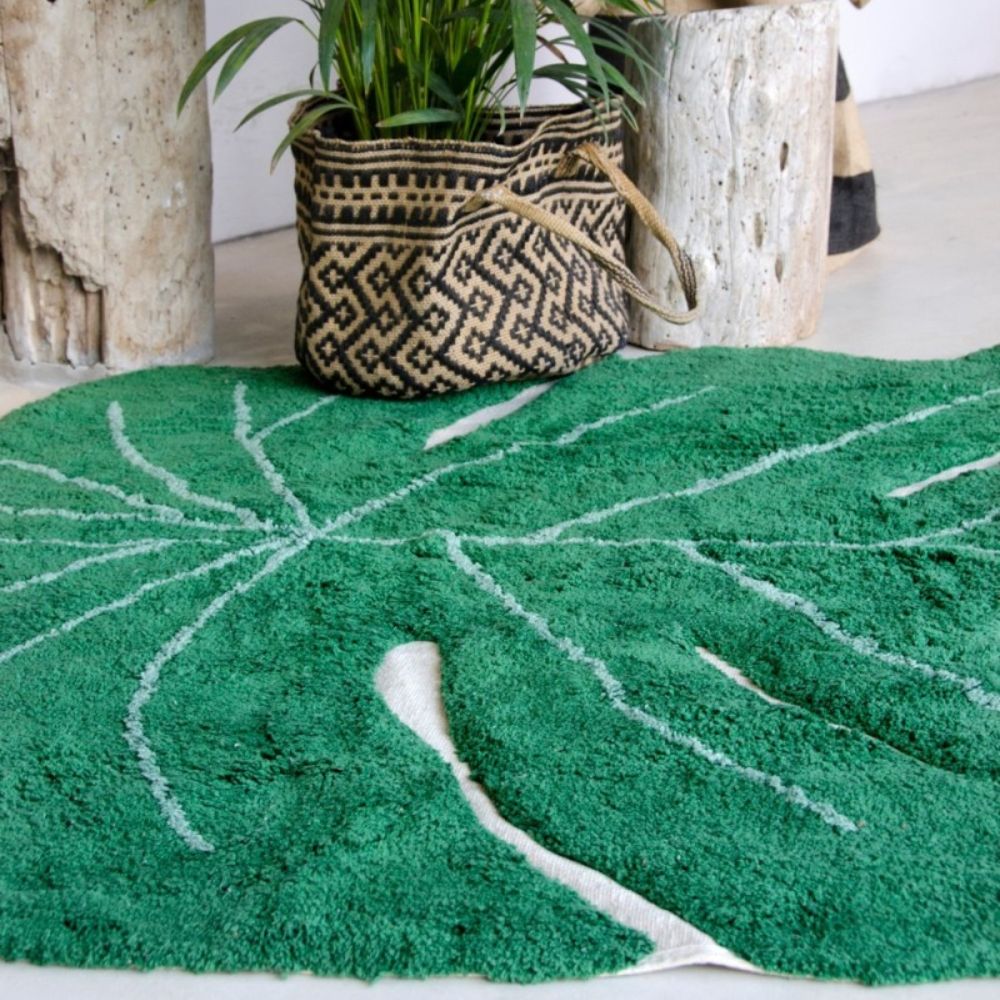 Lorena Canals Monstera Leaf-tæppet er dekoreret med et motiv af store, intens grønne monstera-blade og understreger den trendy botaniske trend, hvilket tilføjer en lys og naturlig følelse til interiøret.