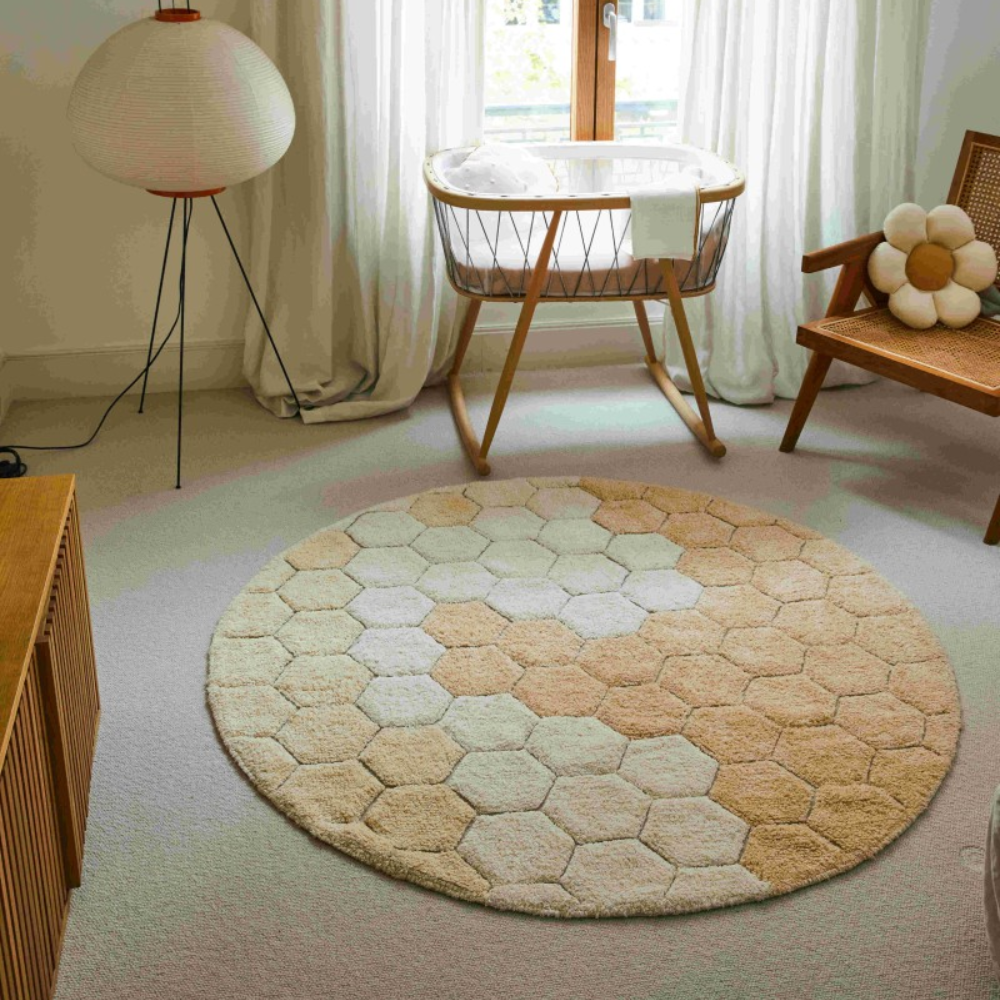 Det runde Honeycomb Golden børnetæppe fra Lorena Canals er et unikt stykke indretning, der bringer varme og tidløs elegance til et interiør.