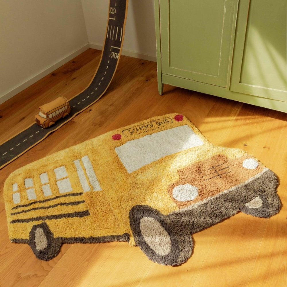Dette håndlavede bomulds tæppe i form af en klassisk skolebus i gul er et øjeblikkeligt blikfang og bliver et unikt designelement i ethvert børneværelse.