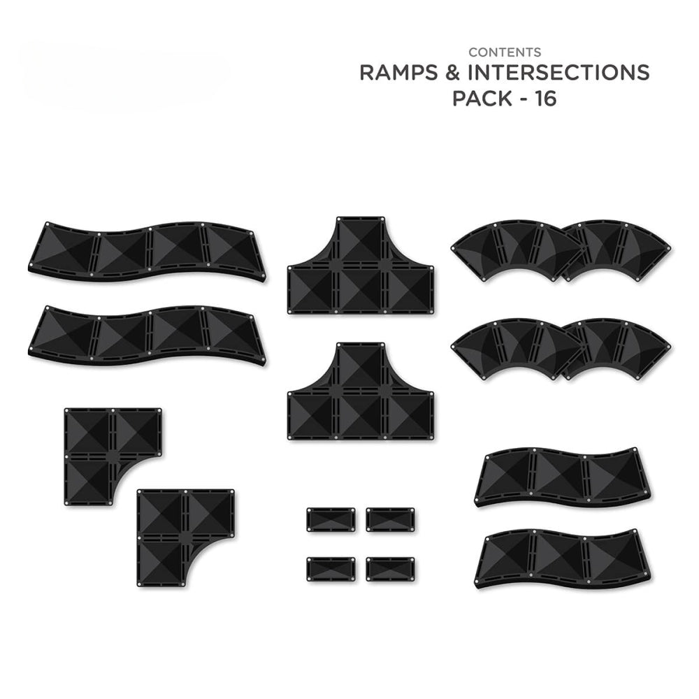Connetix 16-delt sæt med veje, ramper og kryds indeholder unikke magnetiske fliser i vejinspirerede former, herunder kvartcirkler, kurver, kryds og lange og korte ramper, alt sammen i en elegant sort farve.