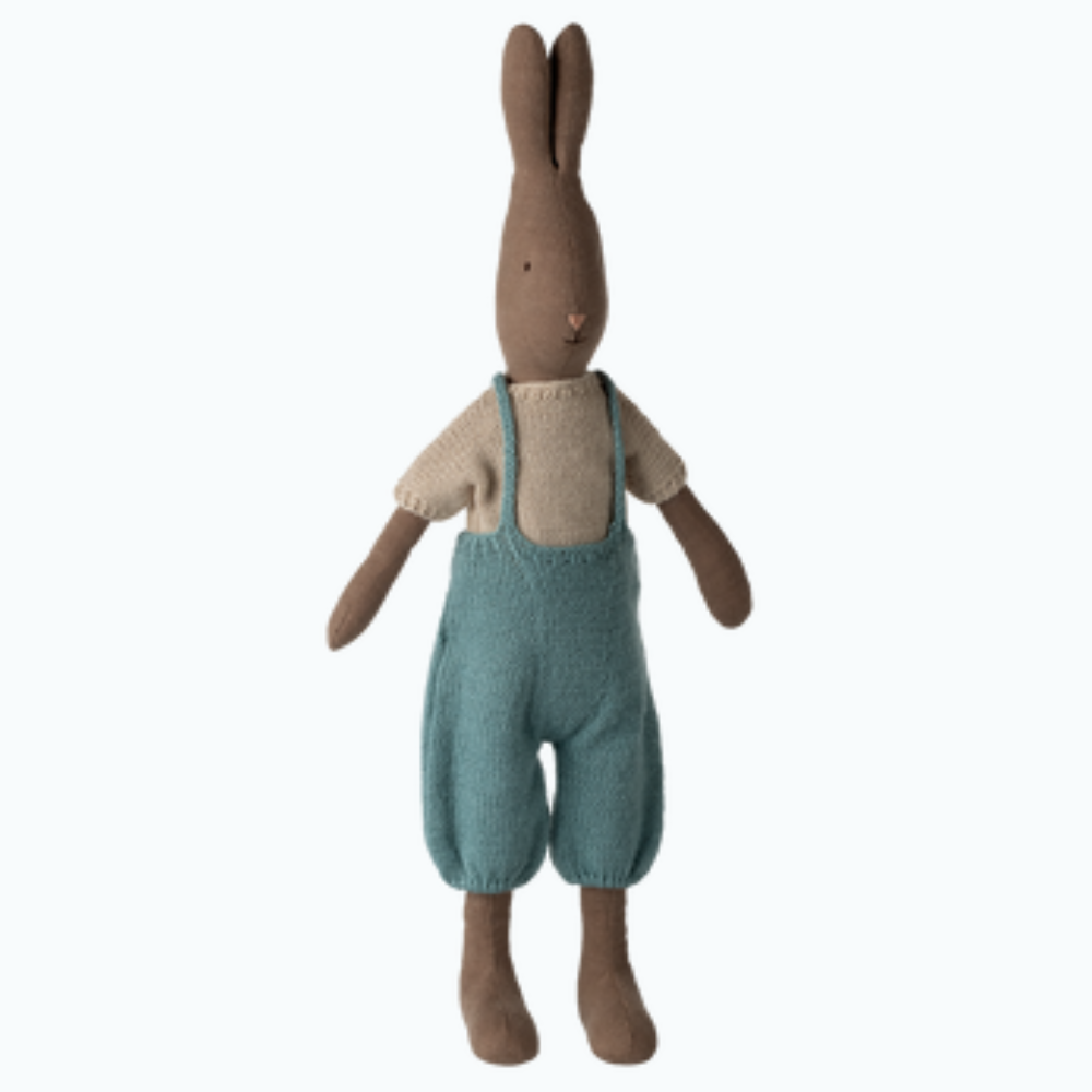 Klædt i en strikket T-shirt og smukke strikkede overalls inviterer denne kanin i overalls til kærlig leg og til at opfinde sine egne historier.