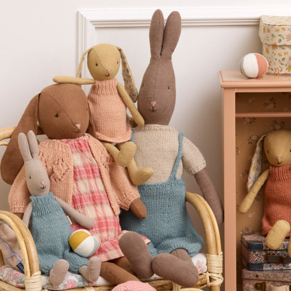 Kaninen i overalls opmuntrer til fantasi, empati og omsorgsfuldhed, mens det skridsikre hørstof beroliger og opfordrer til at putte.