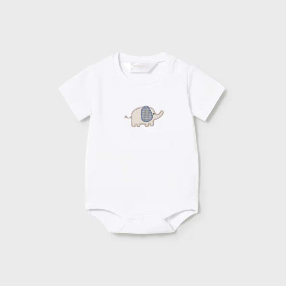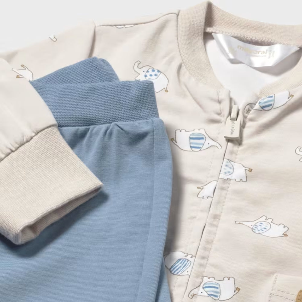 Das Set besteht aus einem weißen Body mit aufgesticktem Baby-Elefanten, einem beigen Sweatshirt mit Reißverschluss und einer blauen Jogginghose, die alle zusammen ein komplettes Set ergeben.