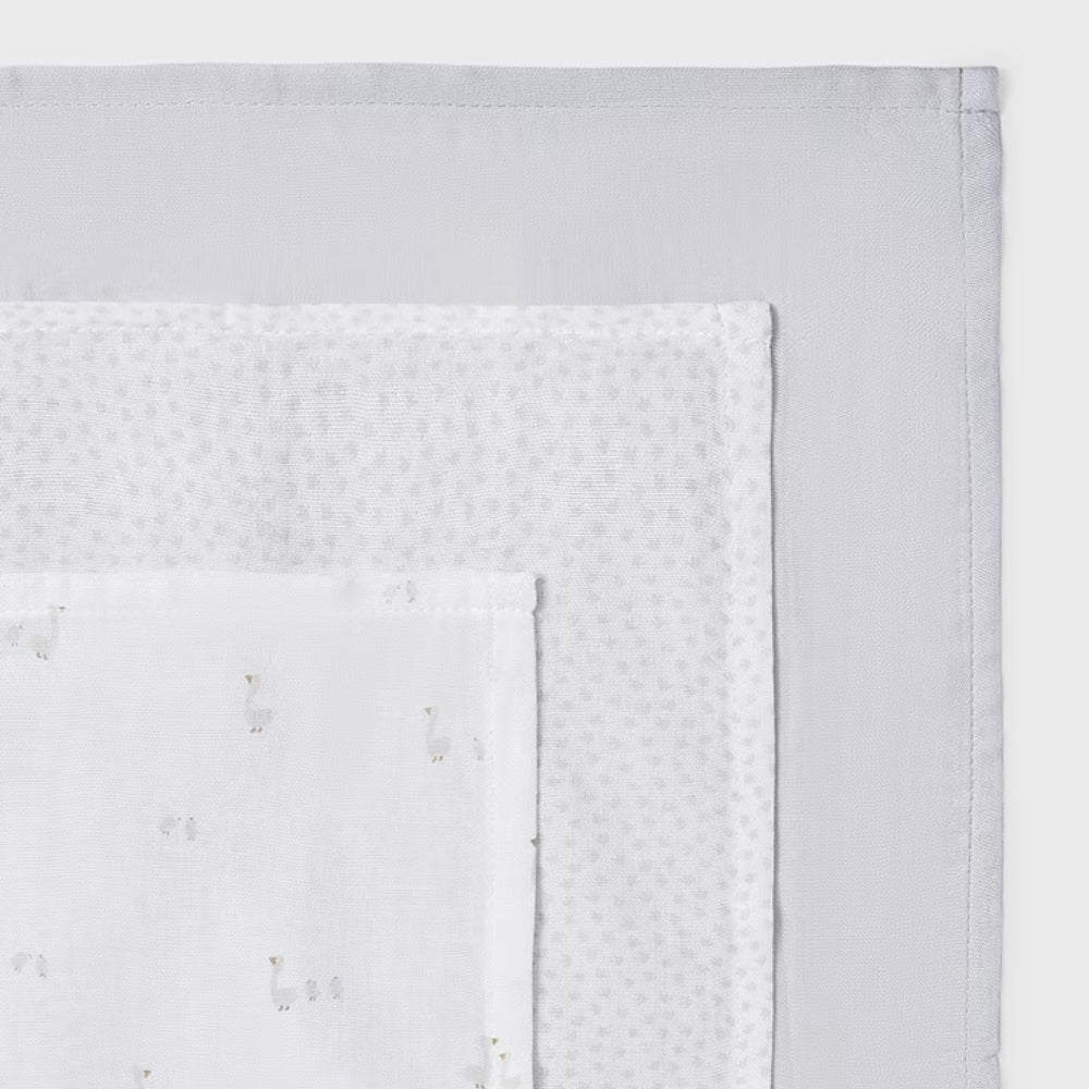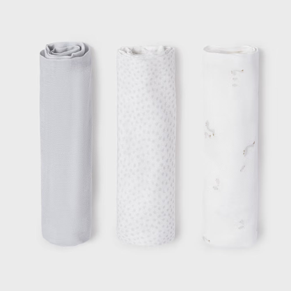 Mayoral-sættet indeholder tre bleer i de afdæmpede farver hvid, grå og trendy grå prikker, der passer til ethvert babyudstyr.