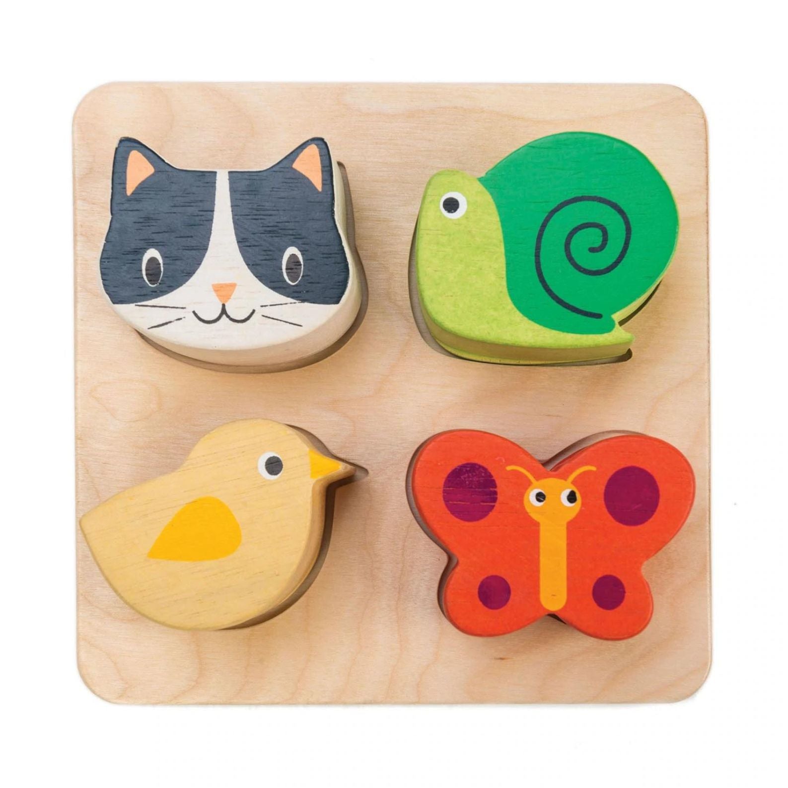 Det sensoriske legetøj består af fire trædyr, en kat, en sommerfugl, en snegl og en fugl, samt en træbase.