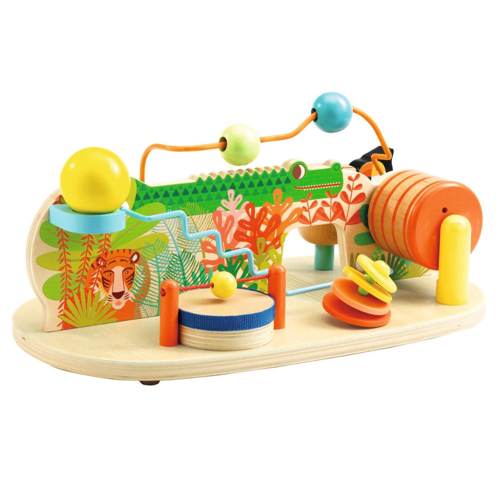 Dette unikke træbord tilbyder op til 8 lydaktiviteter, der får babyen til at opdage nye lyde – fra papegøjens muntre "knock, knock", når den slår på en træcylinder, til den rytmiske "rata, tatata", når en bold glider ned ad ryggen på en krokodille.