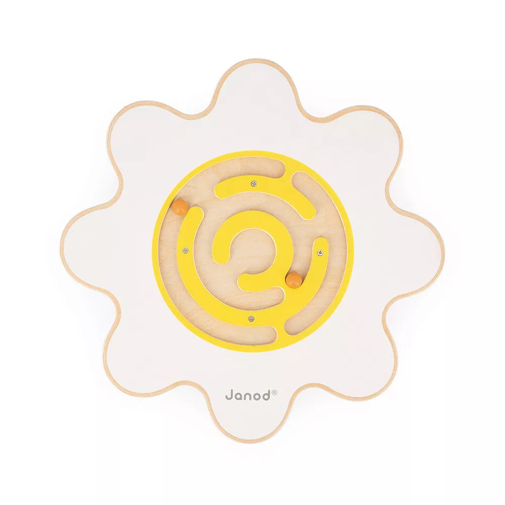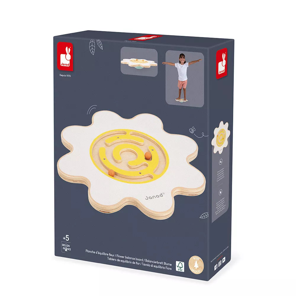 Janods balancebræt til børn med en halvcirkelformet base er formet som en blomst med afrundede kanter, hvide kronblade og en gul labyrint med to kugler, der kan bevæges rundt indeni.