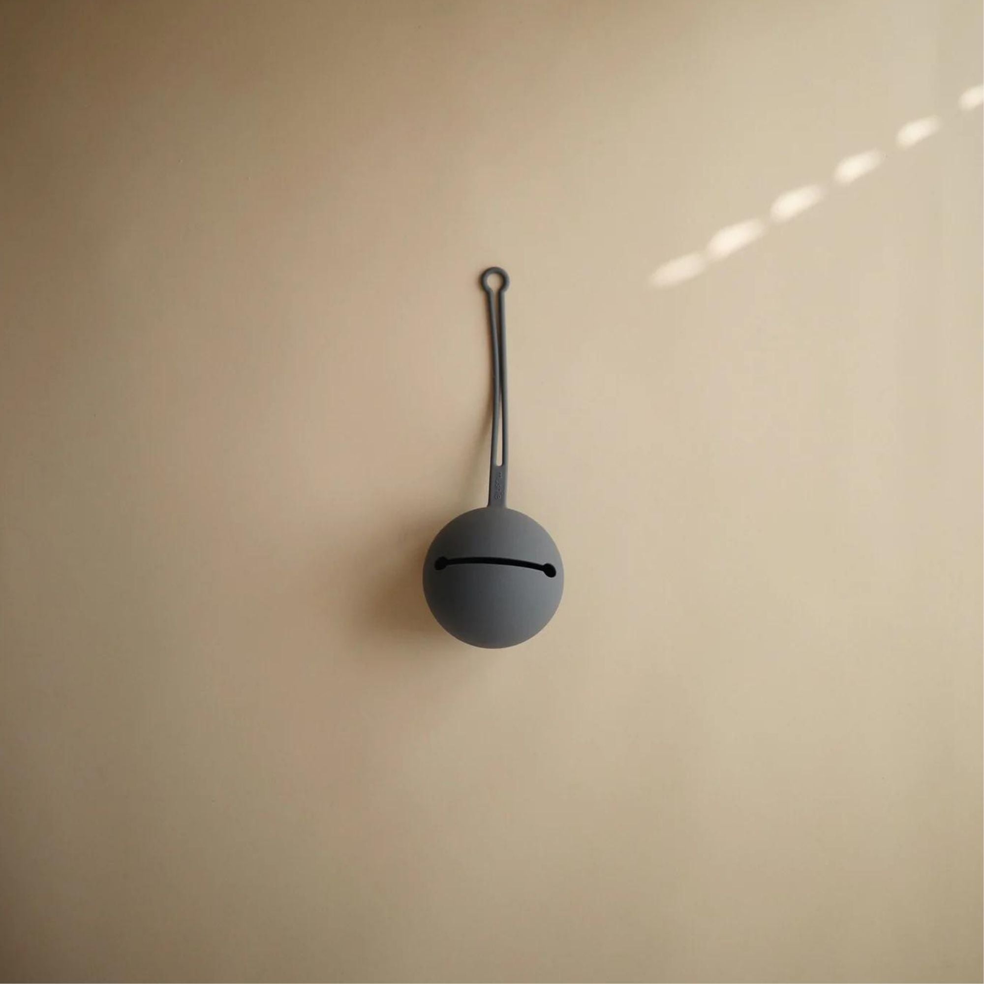 Ball Tradewinds-sutkassen fra Mushie har en speciel fastgørelsesmekanisme, som gør det muligt at fastgøre den til barnevognen, barnesengen eller andre steder.