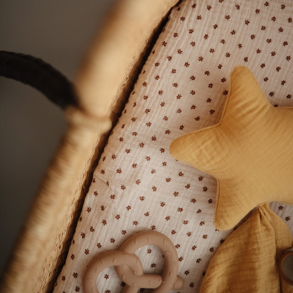 Dejligt muslin-lagen til vugge 60 x 120 cm Bloom Medium, i åndbart Mushie-bomuld.