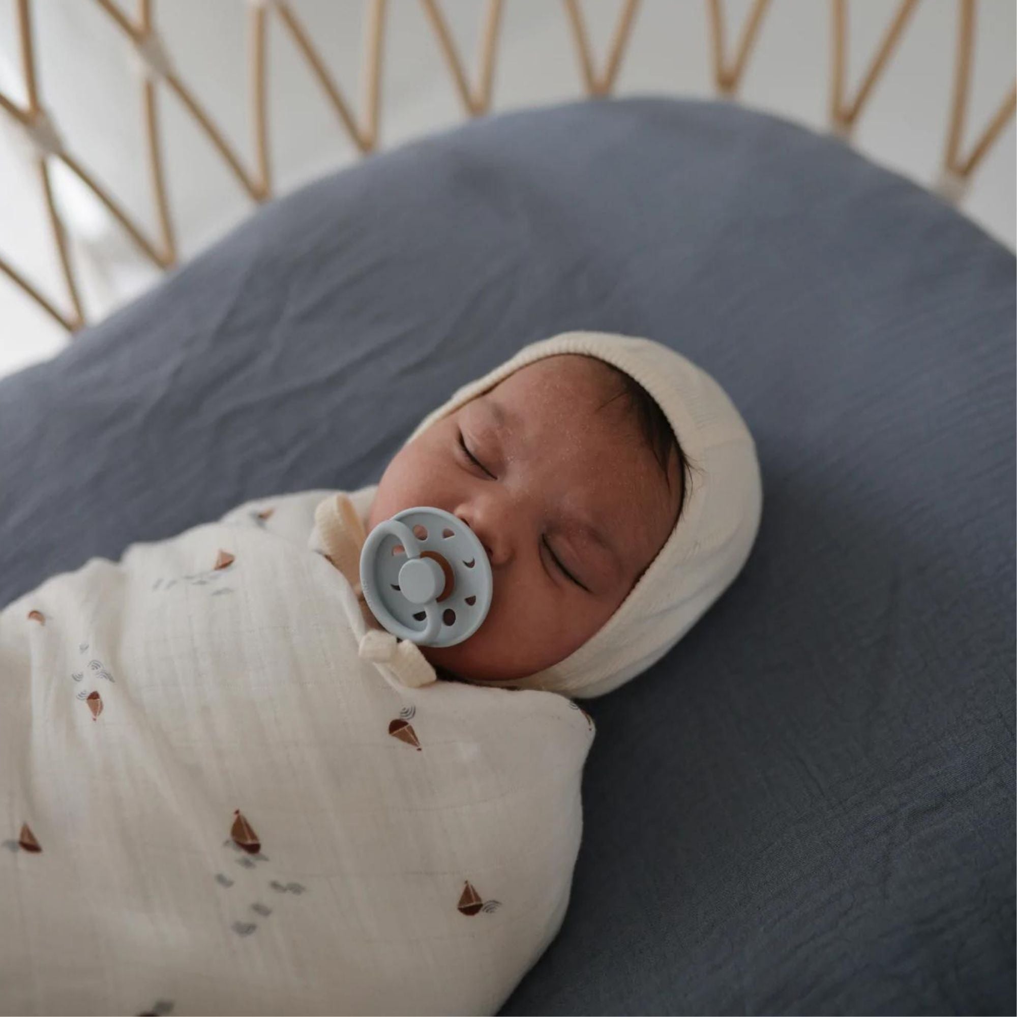 Et dejligt muslin-lagen til vugge, 60 x 120 cm, Tradewinds Medium, i åndbart Mushie-bomuld.