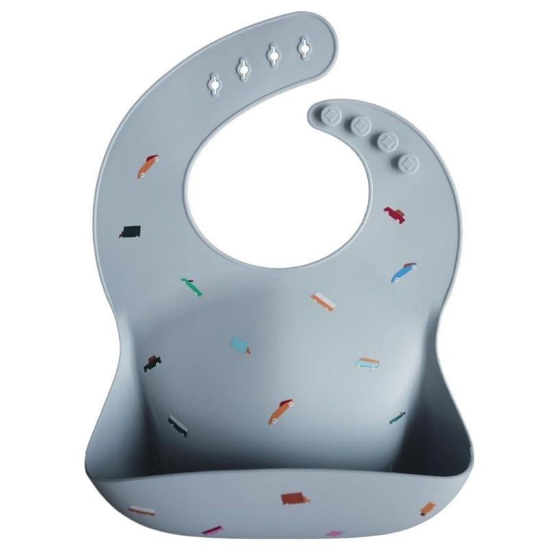 Mushie Retro Cars Silicone Bib er en fantastisk silikonehagesmæk med et klassisk design og et tidløst look.