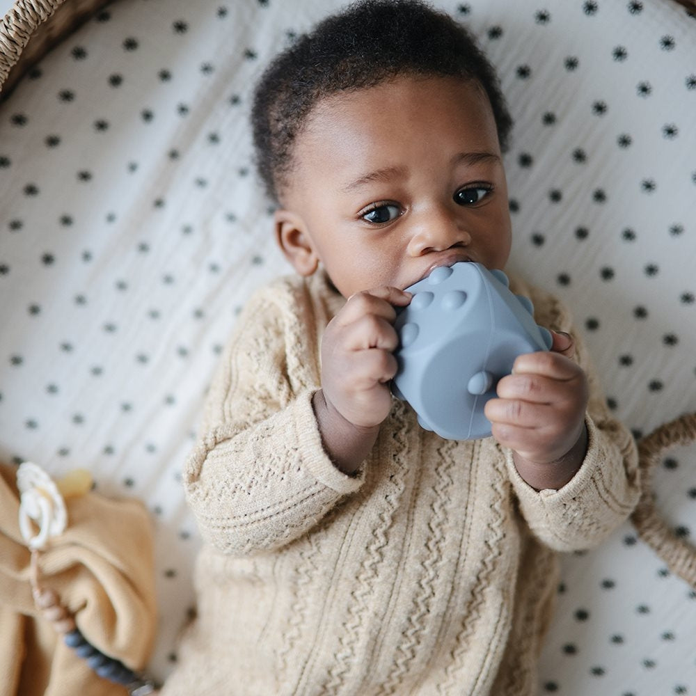 Det er lavet af silikone i fødevarekvalitet i bløde farver og har et enkelt design, der er let for små hænder at gribe fat i.