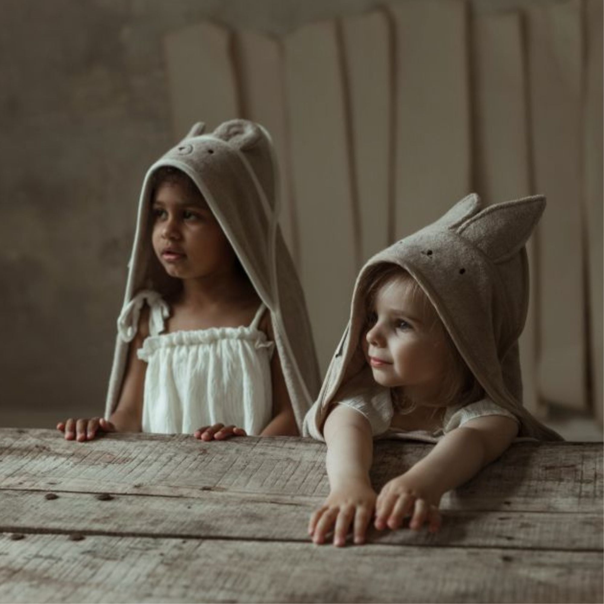 Et beige håndklæde med hætte med ører, øjne og næse.