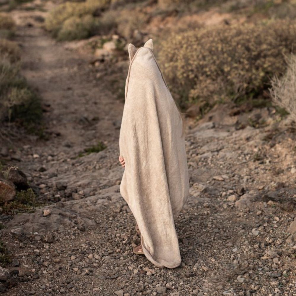Et beige håndklæde med hætte, der har ører, øjne og næse.