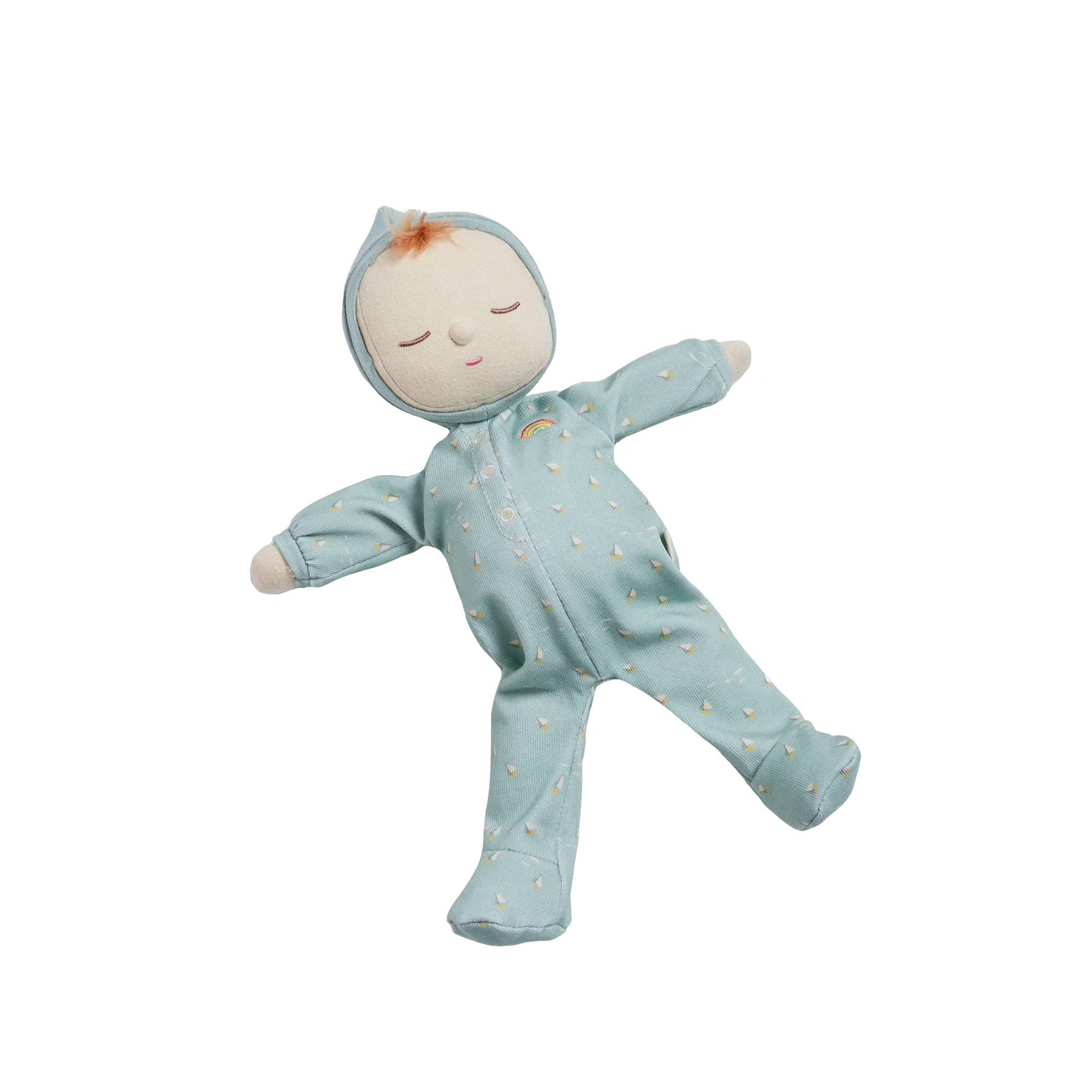 Dozy Dinkum Moppet Ocean babydukke har et nuttet broderet ansigt med en hårlok og er iført en jumpsuit med en regnbue over hjertet.