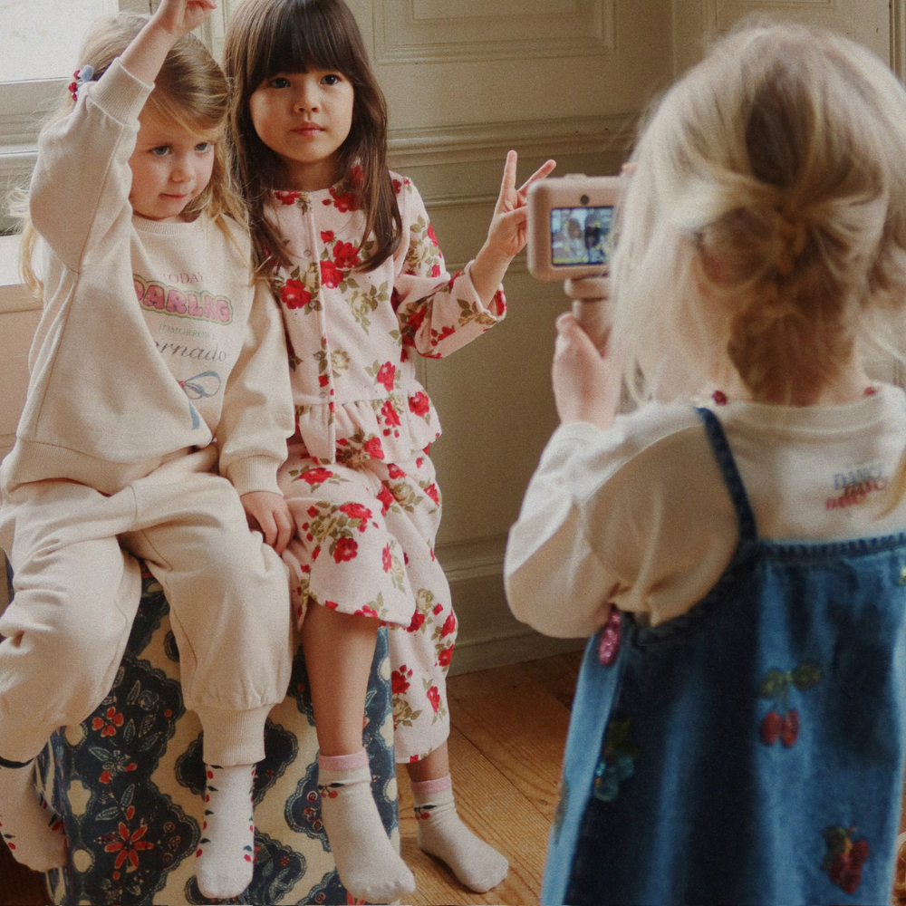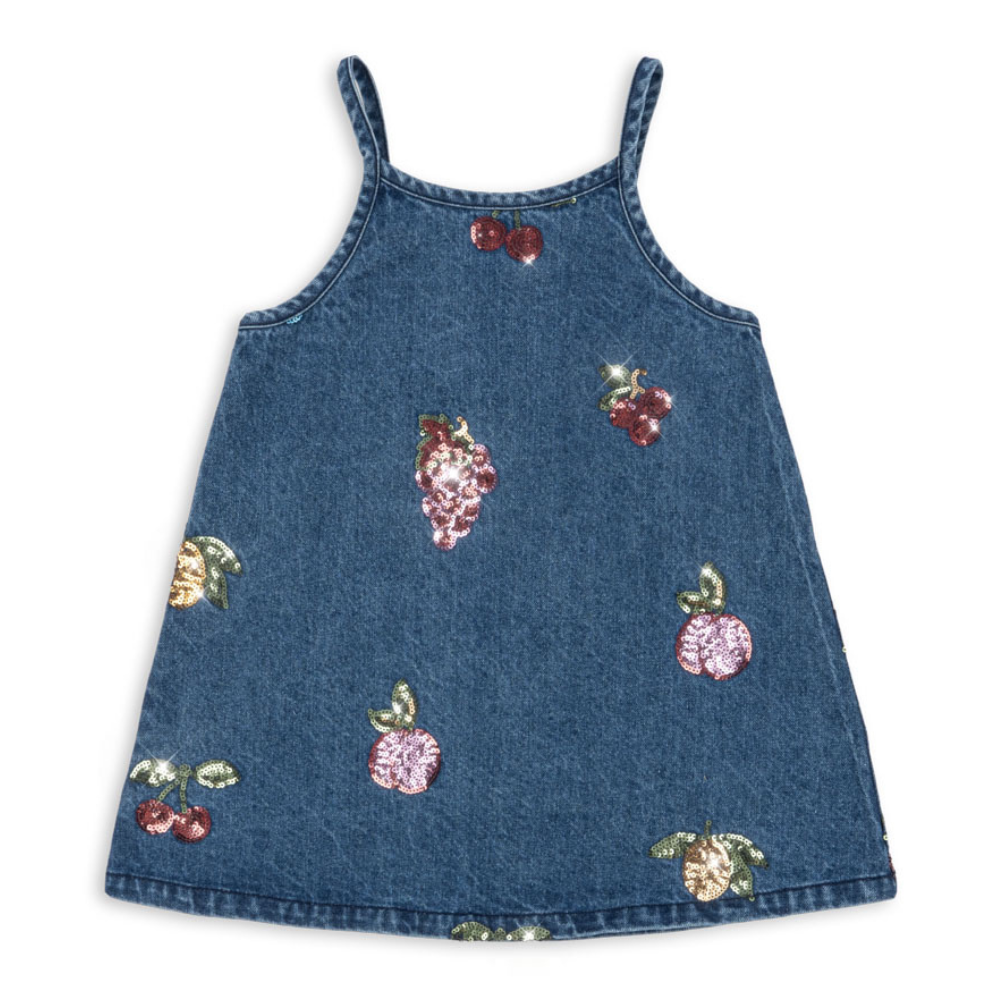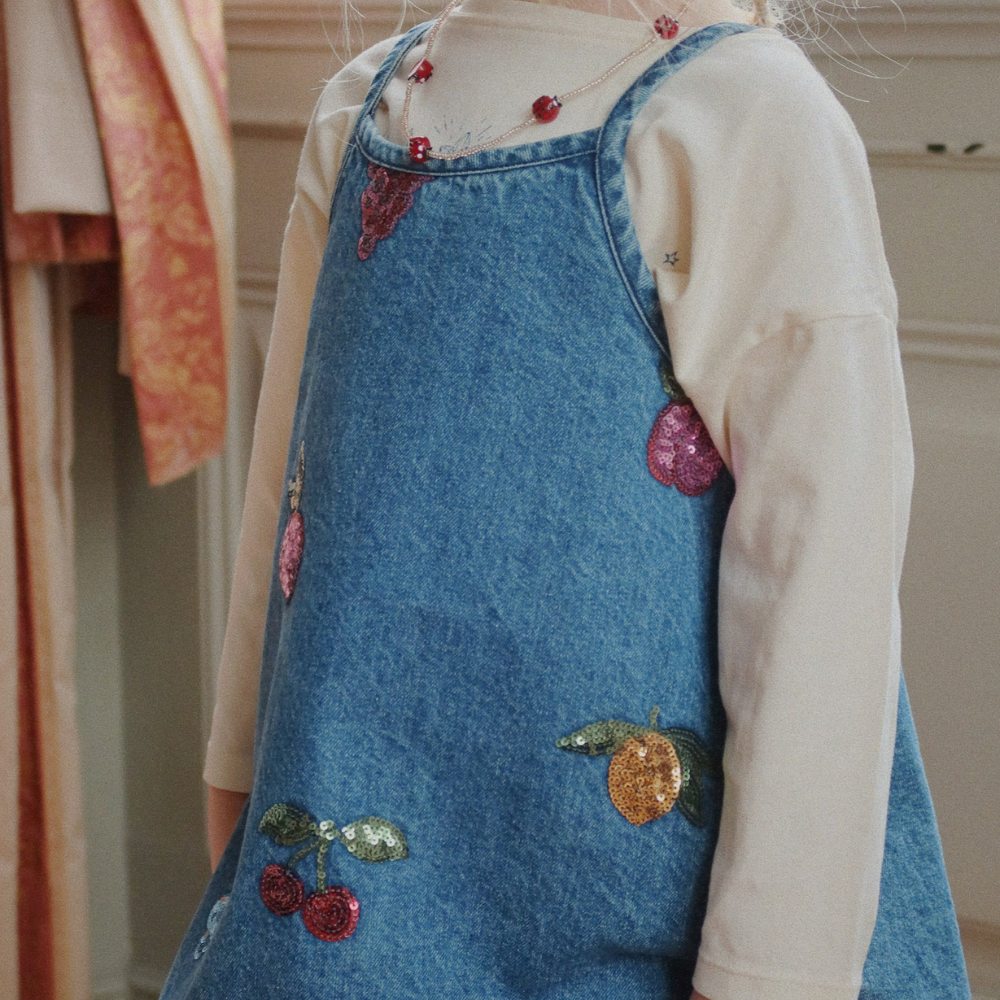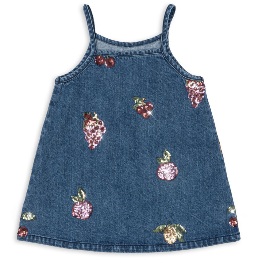 Denne denimkjole til børn fra Konges Slojd imponerer med sin diskrete glans – de broderede frugter med pailletter tilføjer charme og giver ethvert outfit et sommerligt, legesygt look.