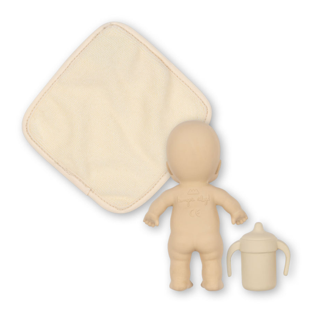 Dukken er lavet af 100 % naturgummi, er blød at røre ved og perfekt til små hænder. Der medfølger et mini-håndklæde og en legflaske.