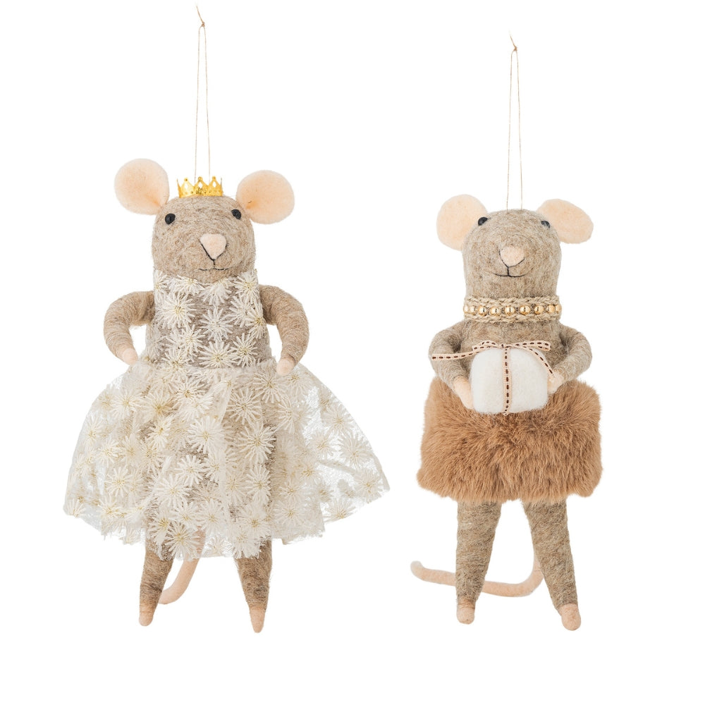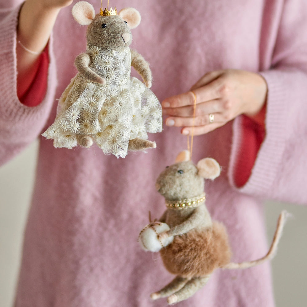 Sættet med to filtede mus lavet af uld imponerer med fine detaljer, der giver dekorationerne et særligt præg.