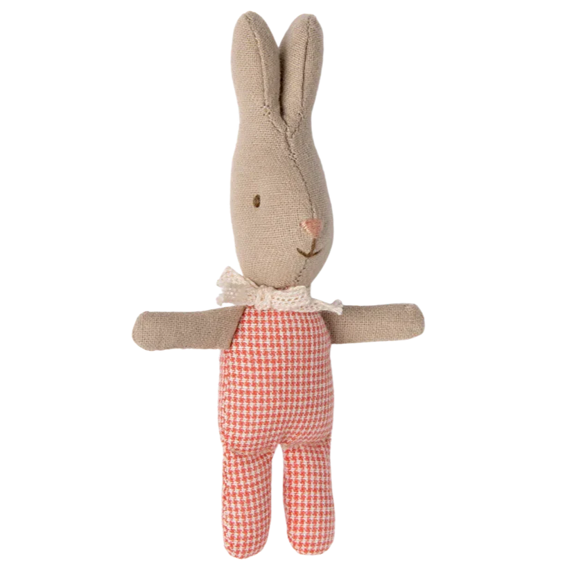 Maileg-kaninen er klædt i et rødt ternet outfit.