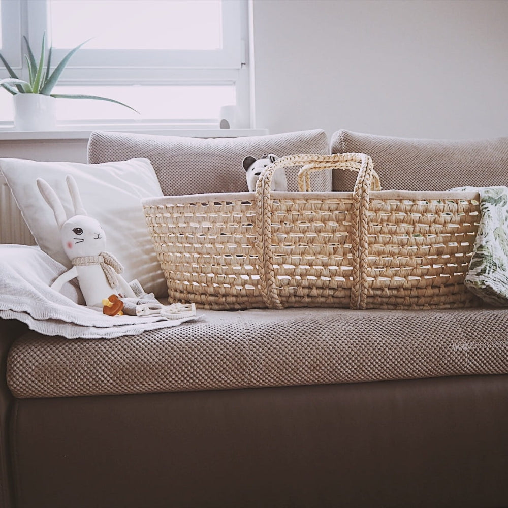 Moseskurven er håndvævet af det naturlige materiale majsblade – den er afsluttet med et stofbånd for at gøre den mere holdbar.