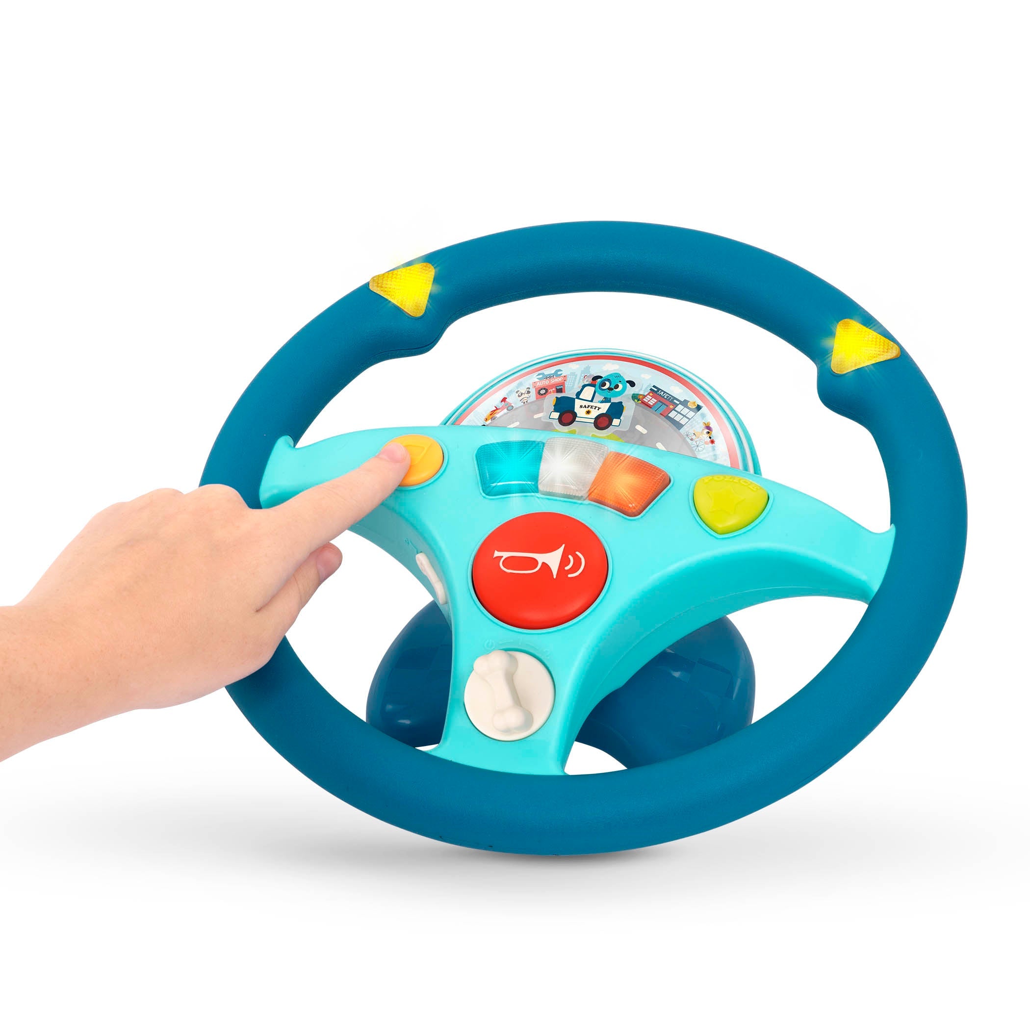Det interaktive børneratt har forudindspillede ægte motorlyde, blinklys, horn og politisirene.