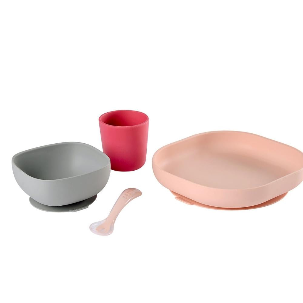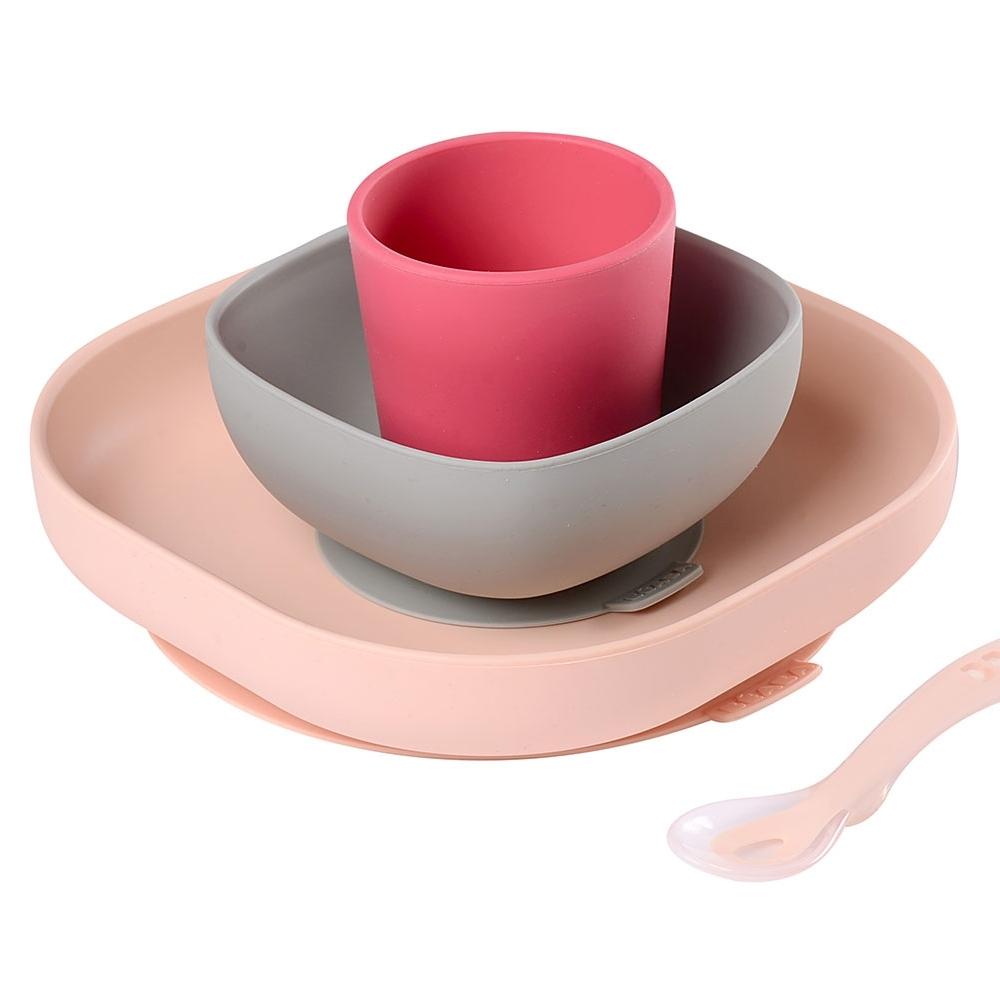 Sættet med silikone-redskaber fra det kendte Pink-mærke Beaba består af en tallerken, en skål, en kop og en træningsske.