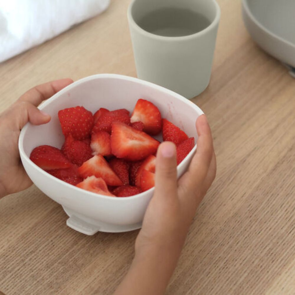 Både tallerkenen og skålen er udstyret med en integreret sugekop, der holder dem fast på bordet og forhindrer, at de ved et uheld flytter sig eller vælter.
