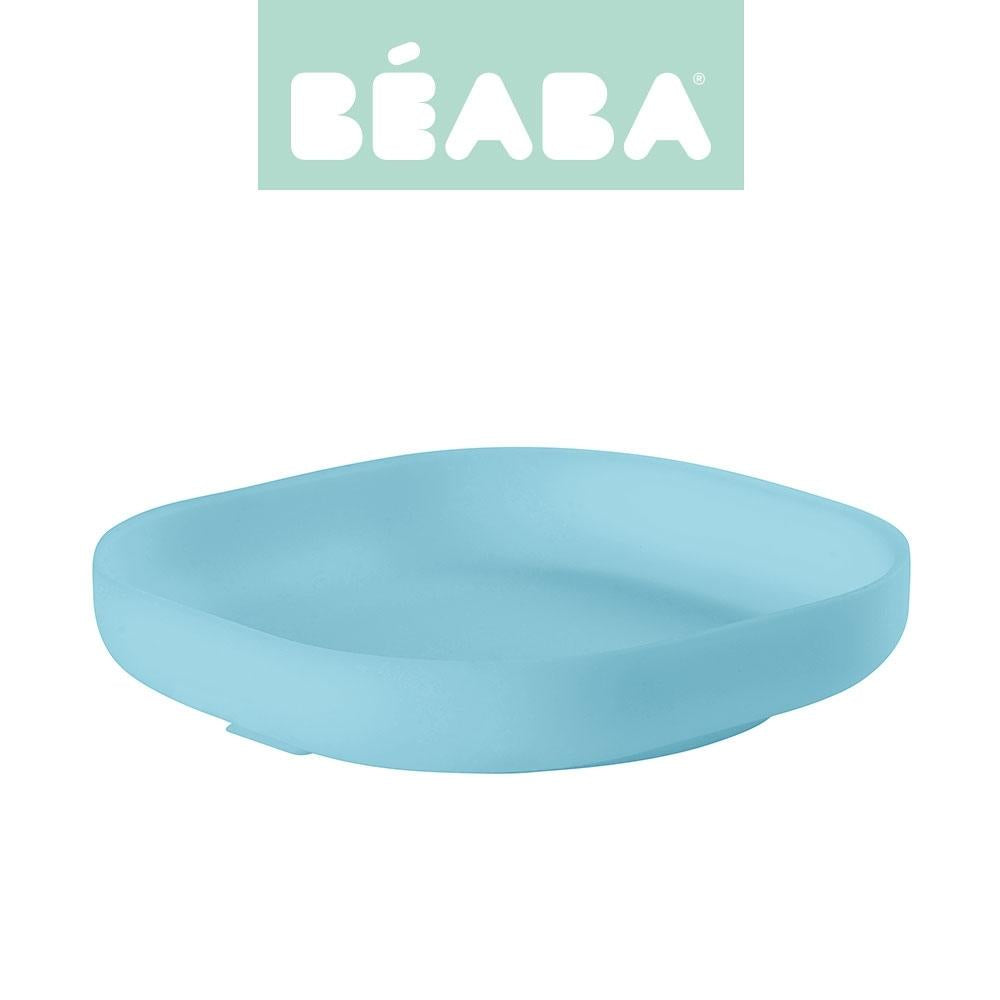 Silikonepladen med sugekop, blå Beaba, har en ergonomisk, firkantet form med høje, afrundede kanter på siderne, som gør det lettere for dit barn at tage sin mad op selv med en gaffel eller ske.