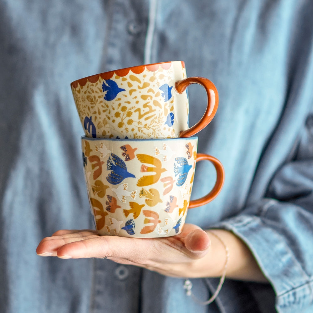 Sættet indeholder to krus af stentøj, dekoreret med et grafisk motiv i varme farver.