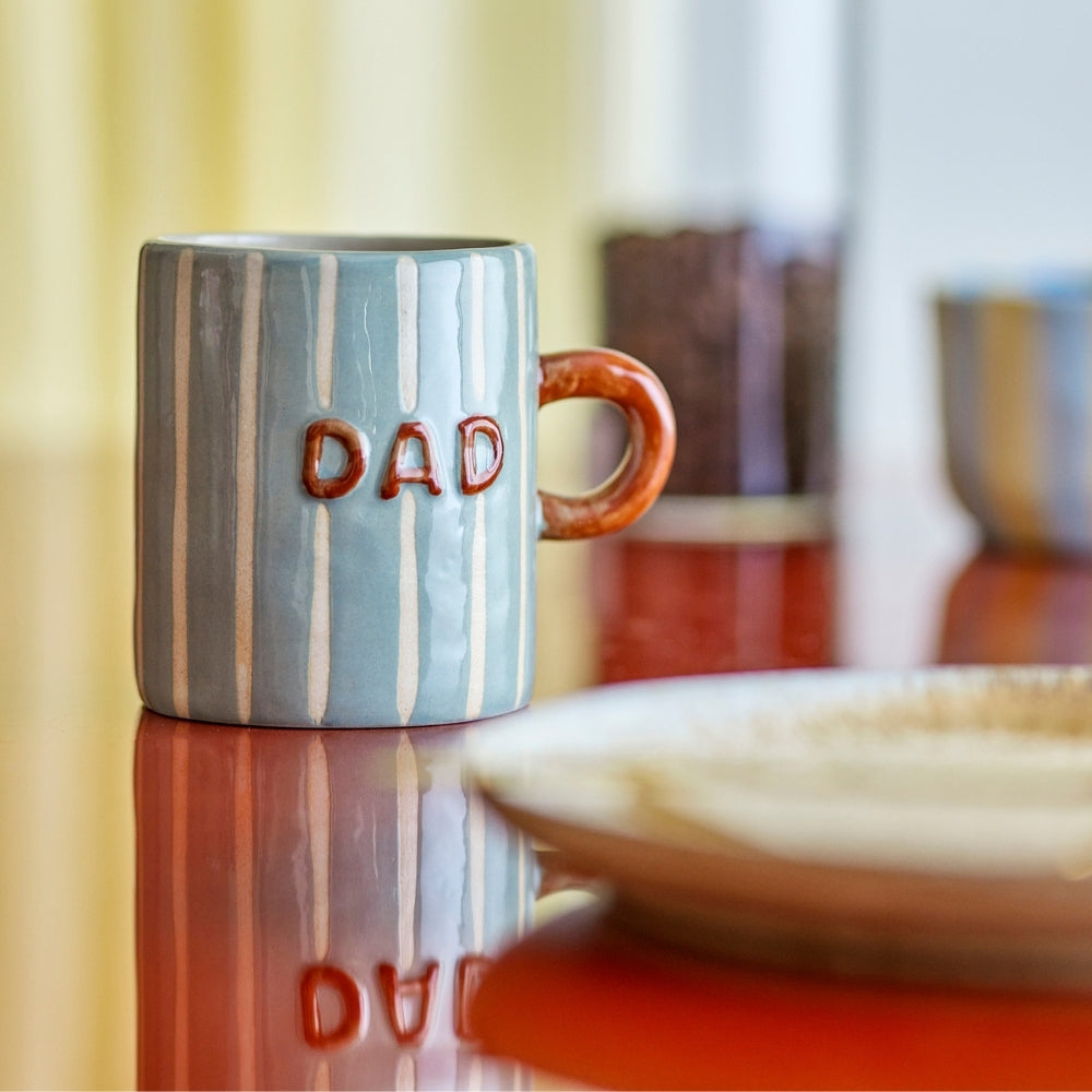 De lodrette cremefarvede striber, det kontrastfulde terrakottafarvede håndtag og 'DAD'-inskriptionen på begge sider giver det et varmt, personligt præg og gør det perfekt som gave.