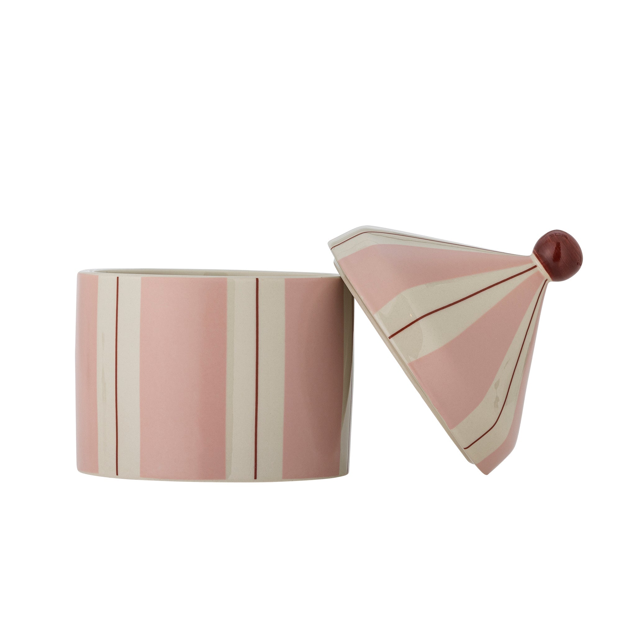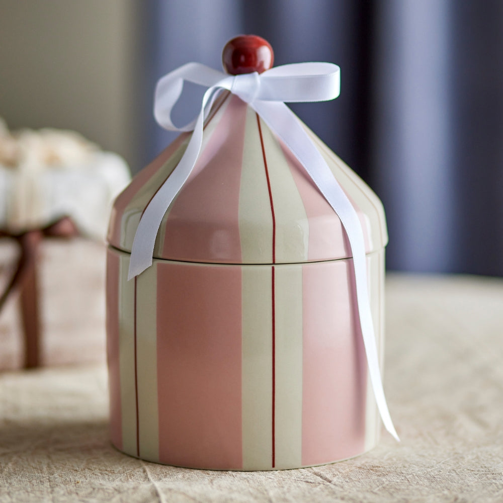 Opbevaringsbeholderen har den søde form af et cirkustelt og er lavet af stentøj med blå og hvide striber.