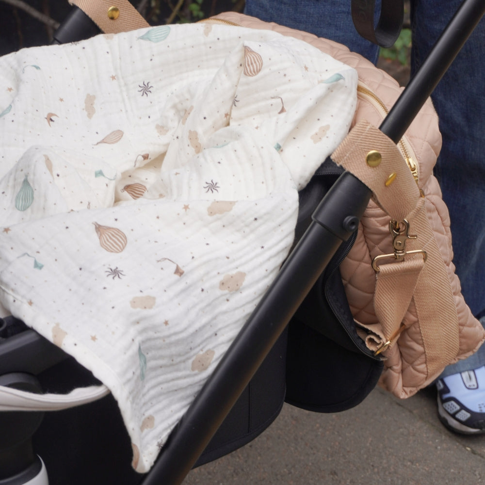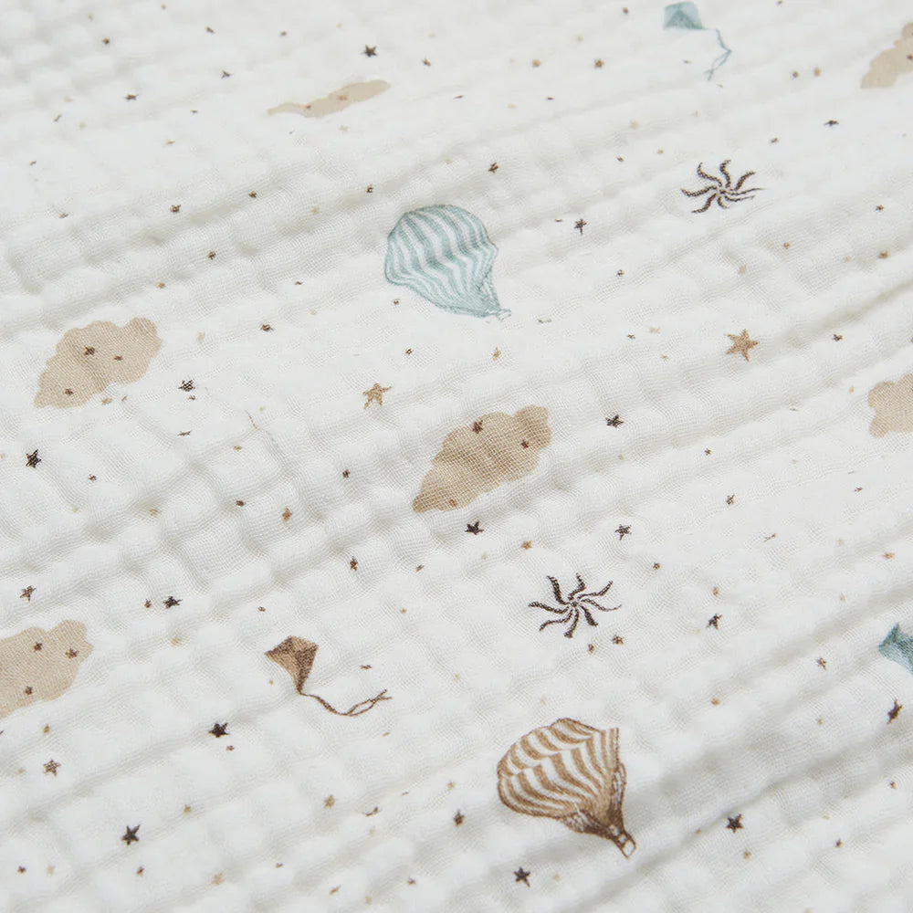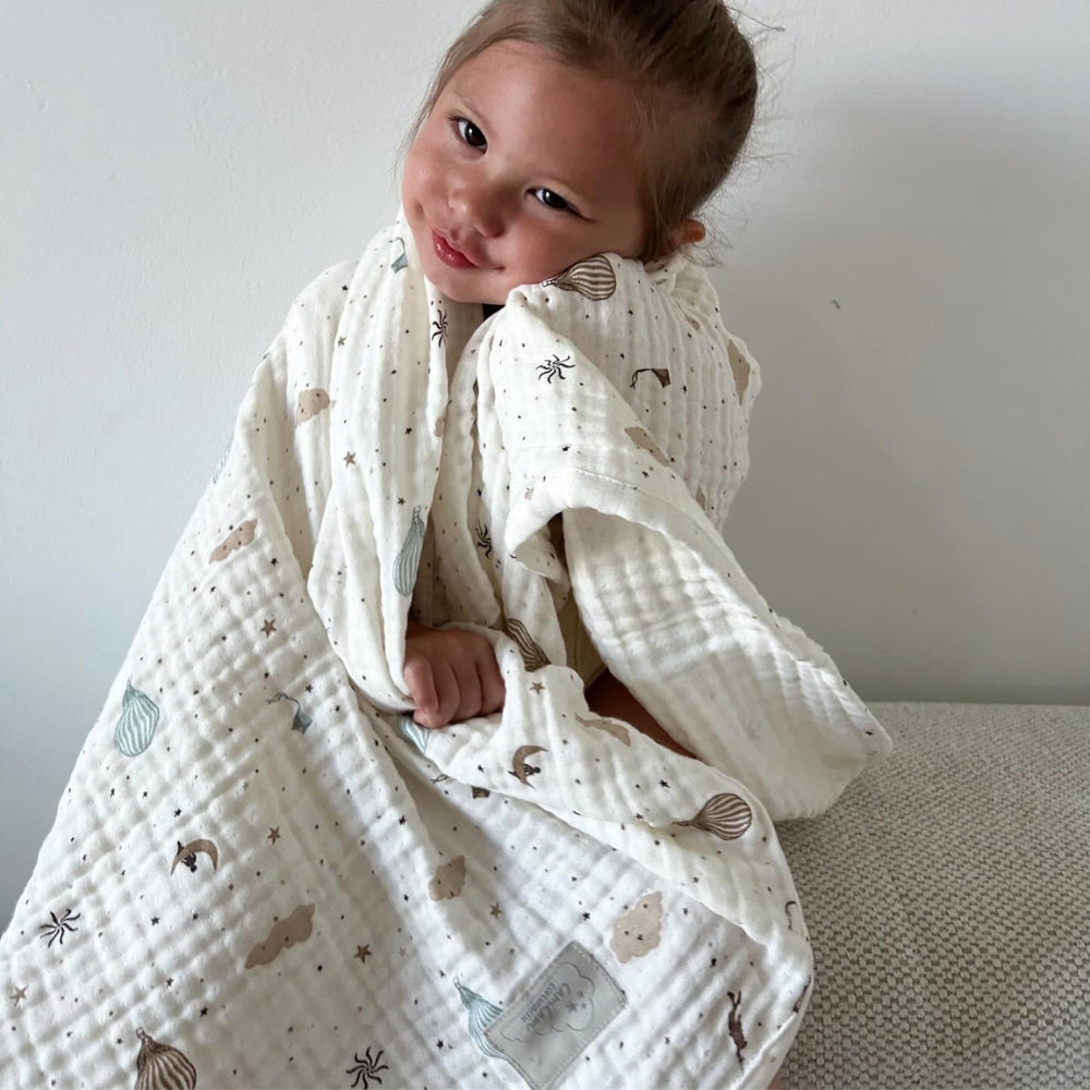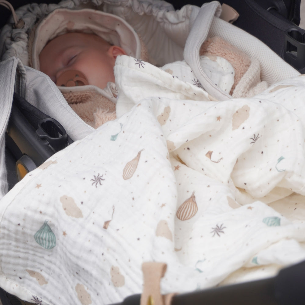 Det delikate muslin-stof, der er kendt for sin exceptionelle lethed og behagelige tekstur, gør tæppet perfekt til at putte babyen, dække ham i barnevognen under gåture eller som et dekorativt tilbehør i babyværelset.