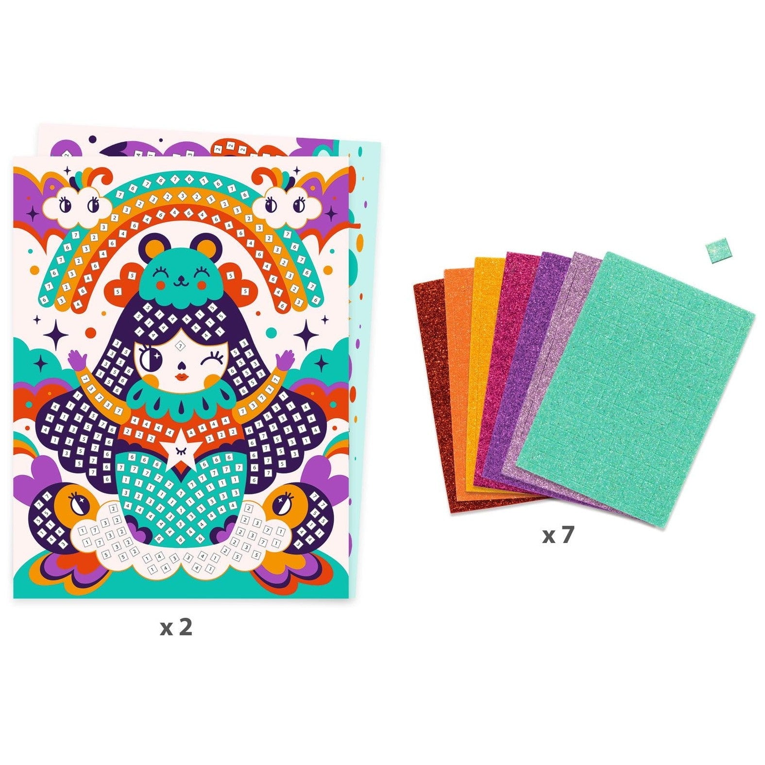 Kunstsættet har numre i illustrationen, som barnet bruger til at lime selvklæbende skumfarvede glitterfirkanter på for at skabe smukke dyrebilleder.